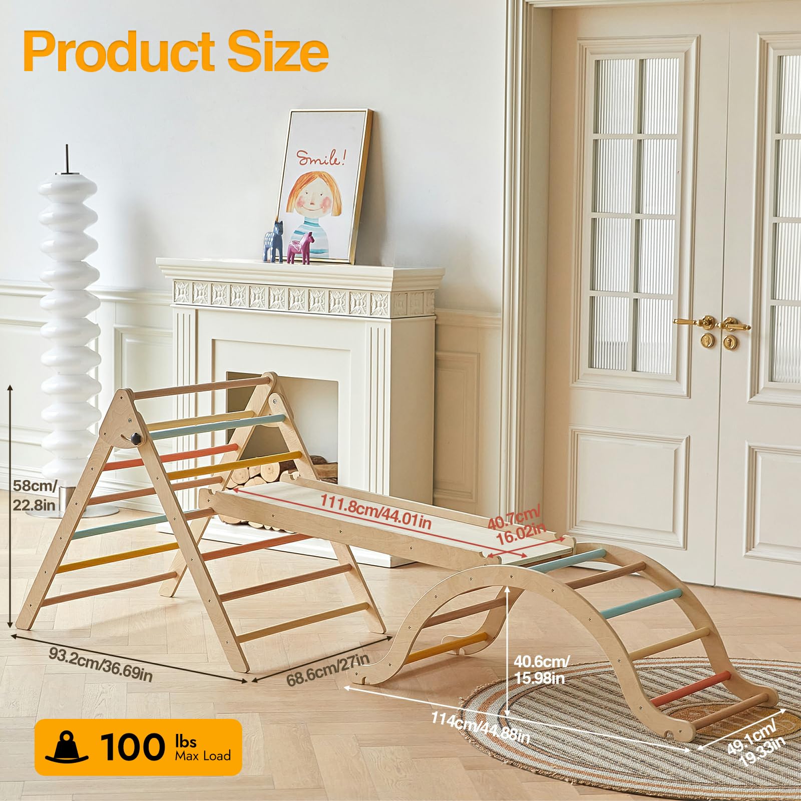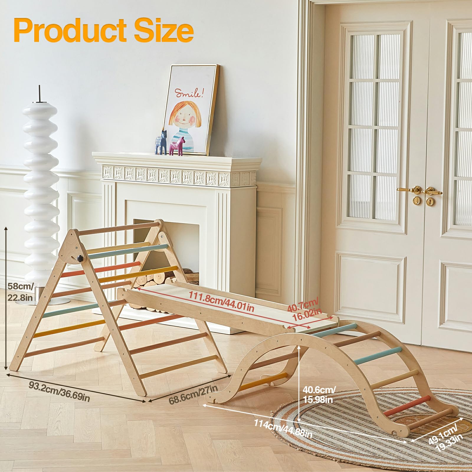 - Vielseitiges 5-in-1-Set: Das Set besteht aus einem Kletterdreieck, einem Kletterbogen und einer umkehrbaren Rampe, die gleichzeitig als Rutsche und Kletterwand dient. Der Bogen kann zudem als Wippe genutzt werden und verfügt über ein einzigartiges Haken-Design für erweiterte Spielmöglichkeiten.