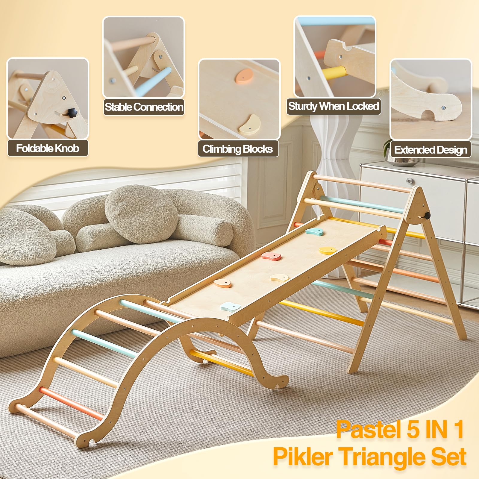 Entdecken Sie dieses multifunktionale 5-in-1 Kletterset in sanften Pastellfarben, das den natürlichen Bewegungsdrang und die Fantasie Ihres Kindes auf spielerische Weise fördert. Es bietet eine abwechslungsreiche Spielumgebung direkt im Kinderzimmer.