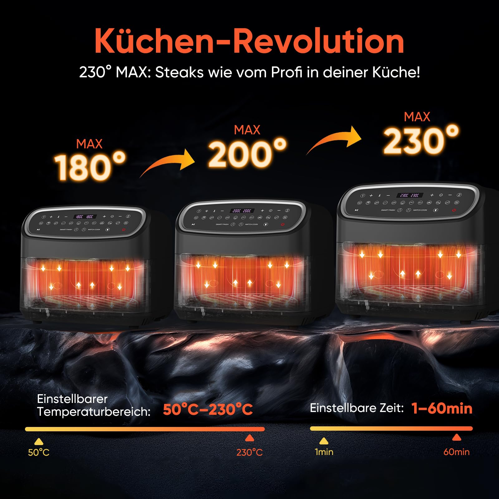 - Leistungsstarke 2800 Watt: Sorgt für schnelles Aufheizen und eine gleichmässige Garleistung bei Temperaturen bis 230 °C.