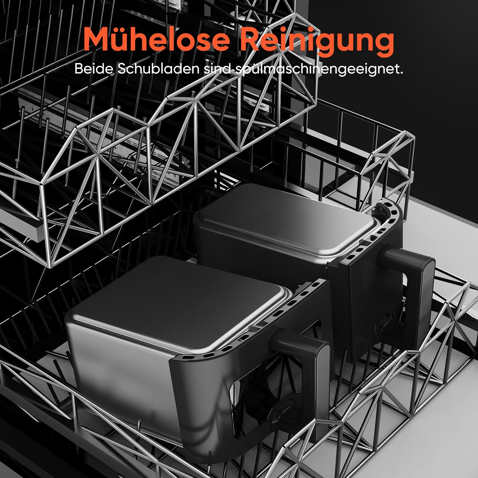 Die Reinigung ist mühelos. Die antihaftbeschichteten Körbe bestehen aus hochwertigem, lebensmittelechtem Edelstahl 304 und sind komplett spülmaschinenfest. Zudem verfügt das Gerät über Sicherheitsfunktionen wie eine automatische Abschaltung beim Herausziehen der Körbe.