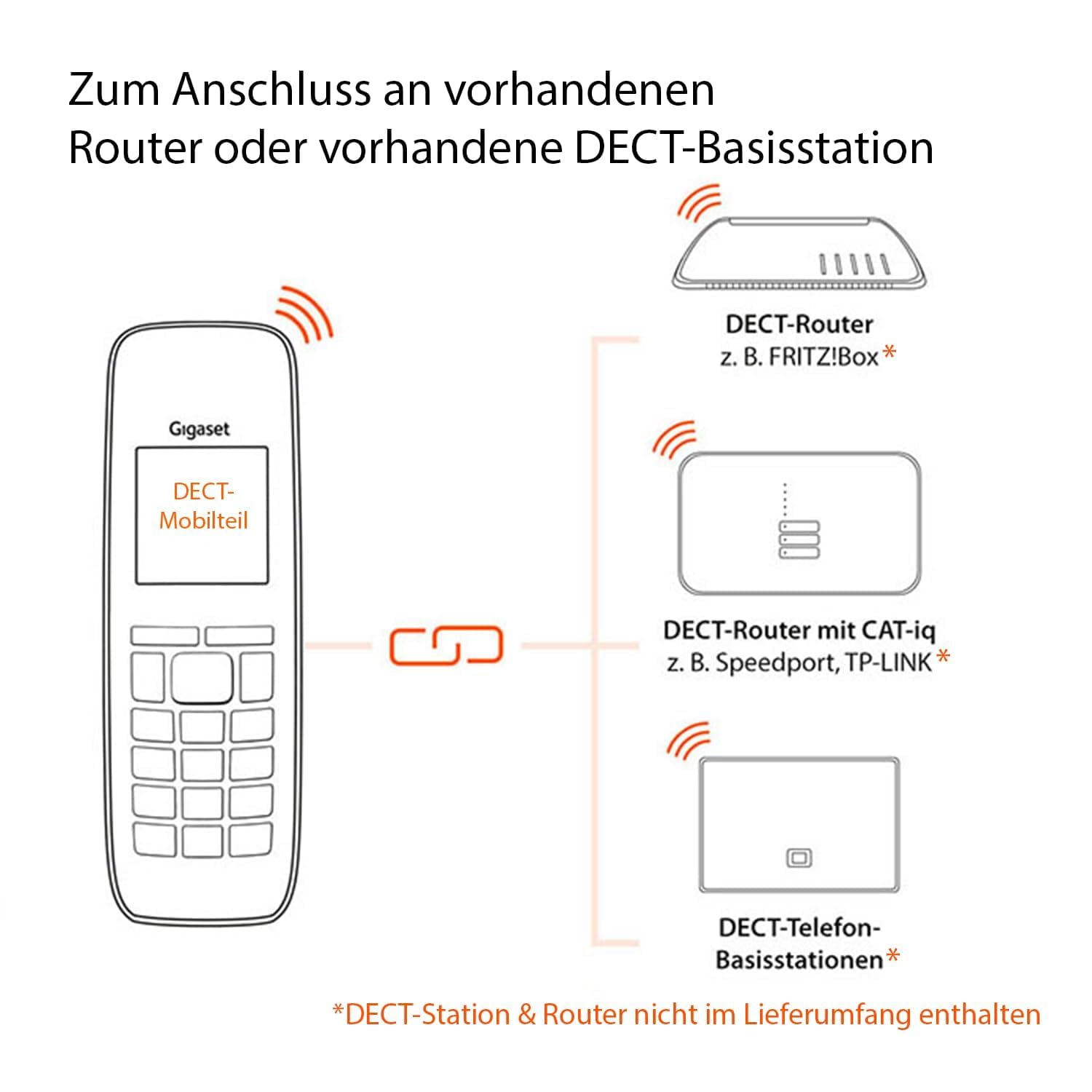 - Flexible Verbindung mit allen gängigen Routern mit DECT/CAT-iq-Funktionalität (z.B. AVM FRITZ!Box, Swisscom Internet-Box) oder als Ergänzung zu einer Gigaset DECT-Basisstation.