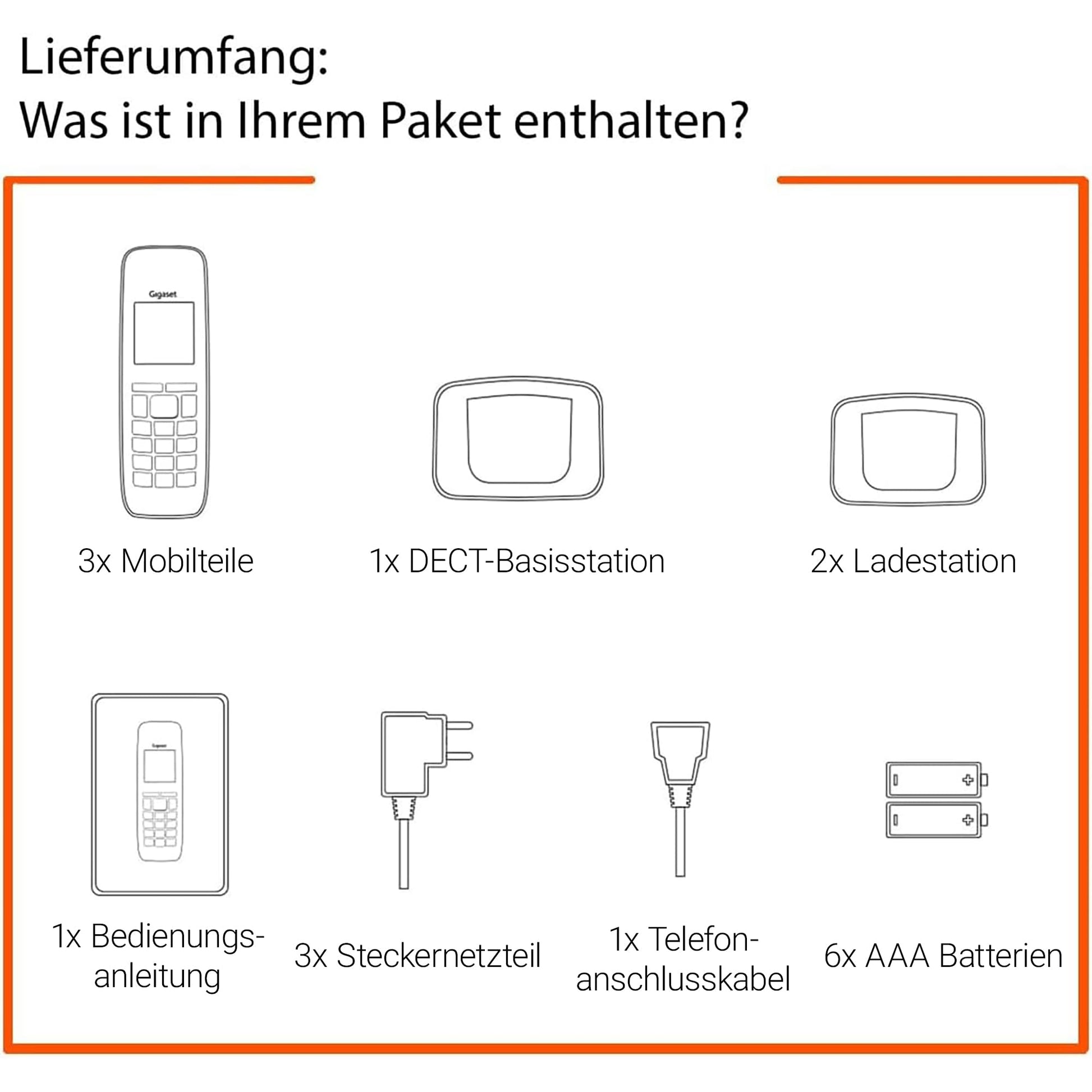 Dieses Set besteht aus einer Basisstation und insgesamt drei Mobilteilen, die Sie flexibel in Ihrem Zuhause oder Büro verteilen können. Interne, kostenlose Gespräche zwischen den einzelnen Mobilteilen sind problemlos möglich.