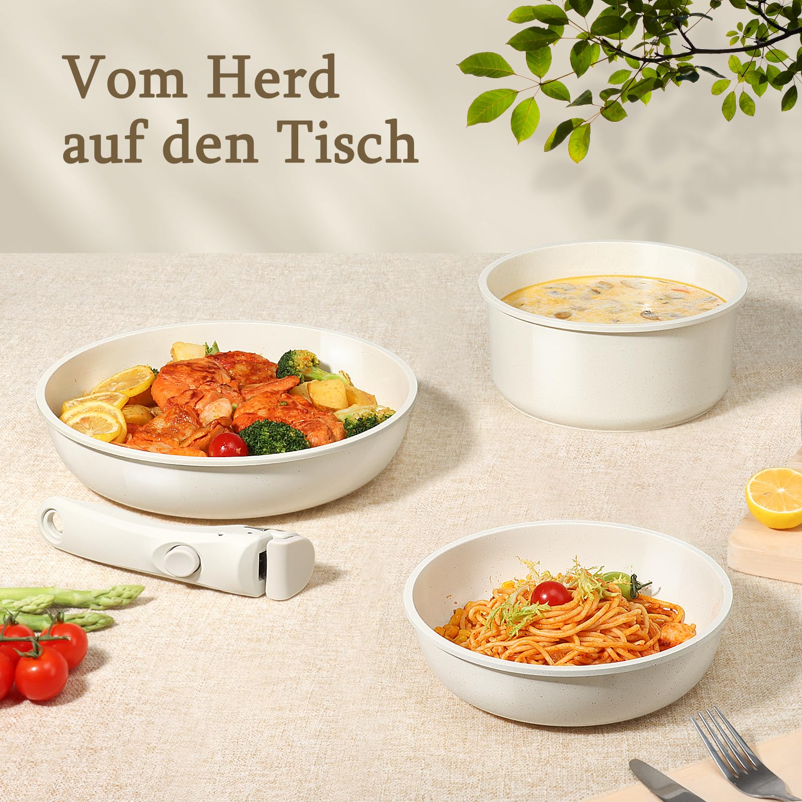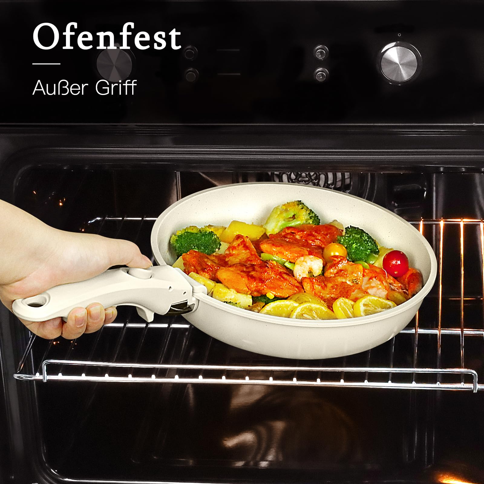 Das durchdachte System mit den abnehmbaren Griffen ist der wahre Star dieses Sets. Verwandeln Sie eine Pfanne vom Herd direkt in eine Auflaufform für den Backofen oder eine elegante Servierschale für den Esstisch. Nach dem Gebrauch lassen sich alle Teile perfekt ineinander stapeln und sparen so wertvollen Platz in Ihren Küchenschränken – ideal für kompakte Küchen, Wohnmobile oder für alle, die Ordnung schätzen.
