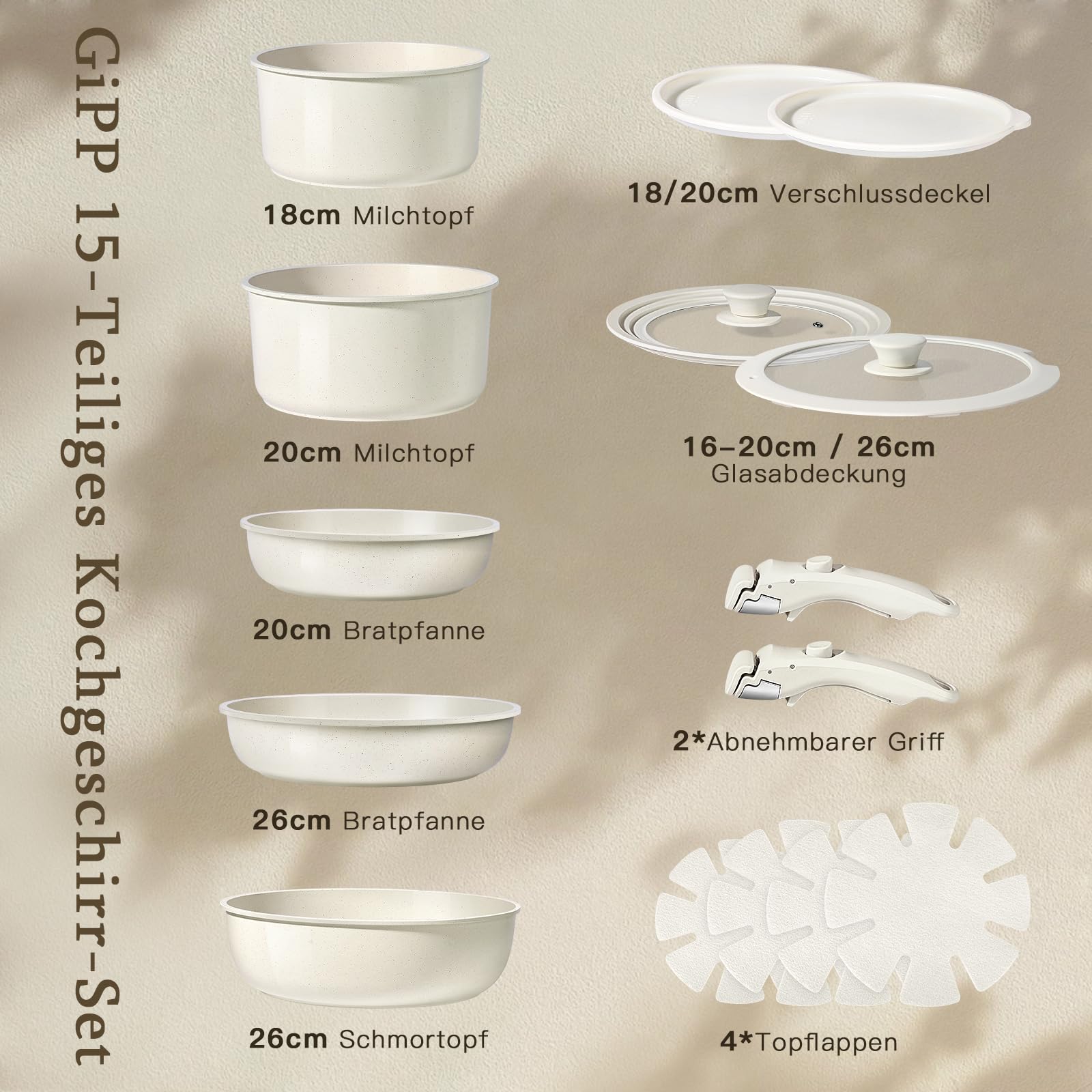 Die Griffe sind für einen stabilen und sicheren Halt konzipiert. Das Set enthält: 3 Pfannen (Ø 20cm, Ø 26cm, hohe Pfanne Ø 26cm), 2 Töpfe (18cm, 20cm), 2 abnehmbare Griffe, 2 Glasdeckel, 2 Silikon-Frischhaltedeckel und 4 Filz-Topfschoner.