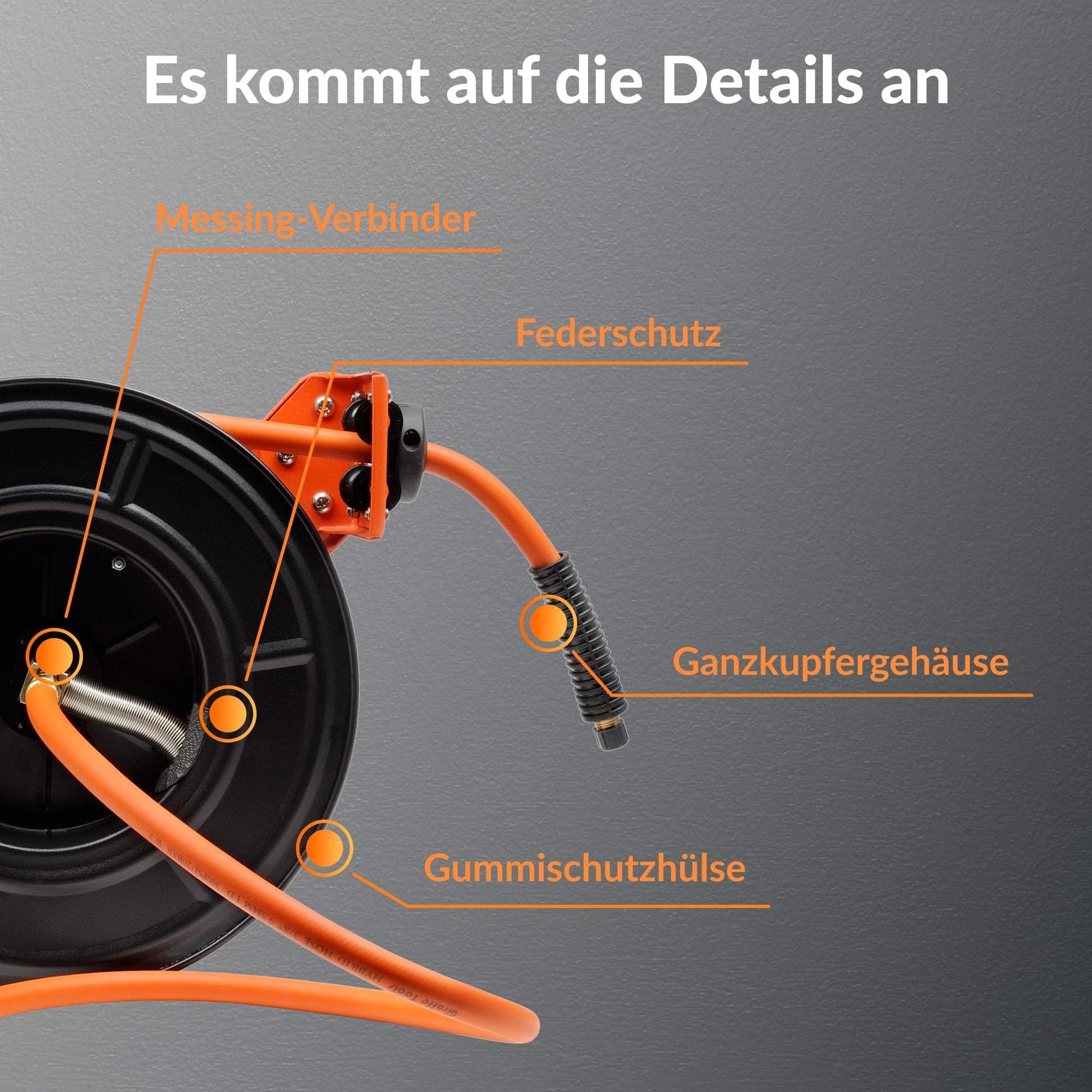 - Arretierfunktion: Ein Sperrmechanismus fixiert den Schlauch zuverlässig in jeder gewünschten Länge.