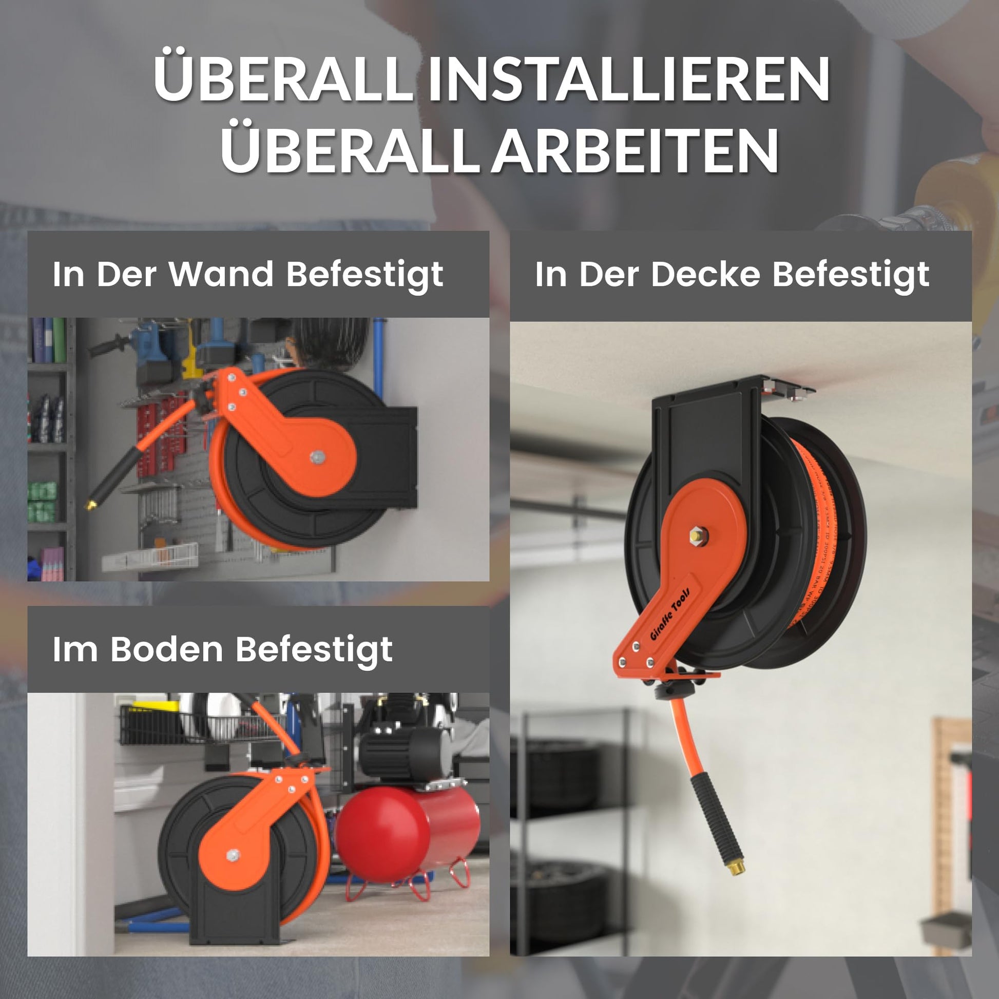 Dieser automatische Druckluftschlauch-Aufroller von Giraffe Tools bringt Ordnung und Effizienz in Ihre Werkstatt, Garage oder Ihren Betrieb. Schluss mit verhedderten Schläuchen und Stolperfallen – konzentrieren Sie sich voll und ganz auf Ihre Arbeit mit einem stets aufgeräumten Arbeitsplatz.
