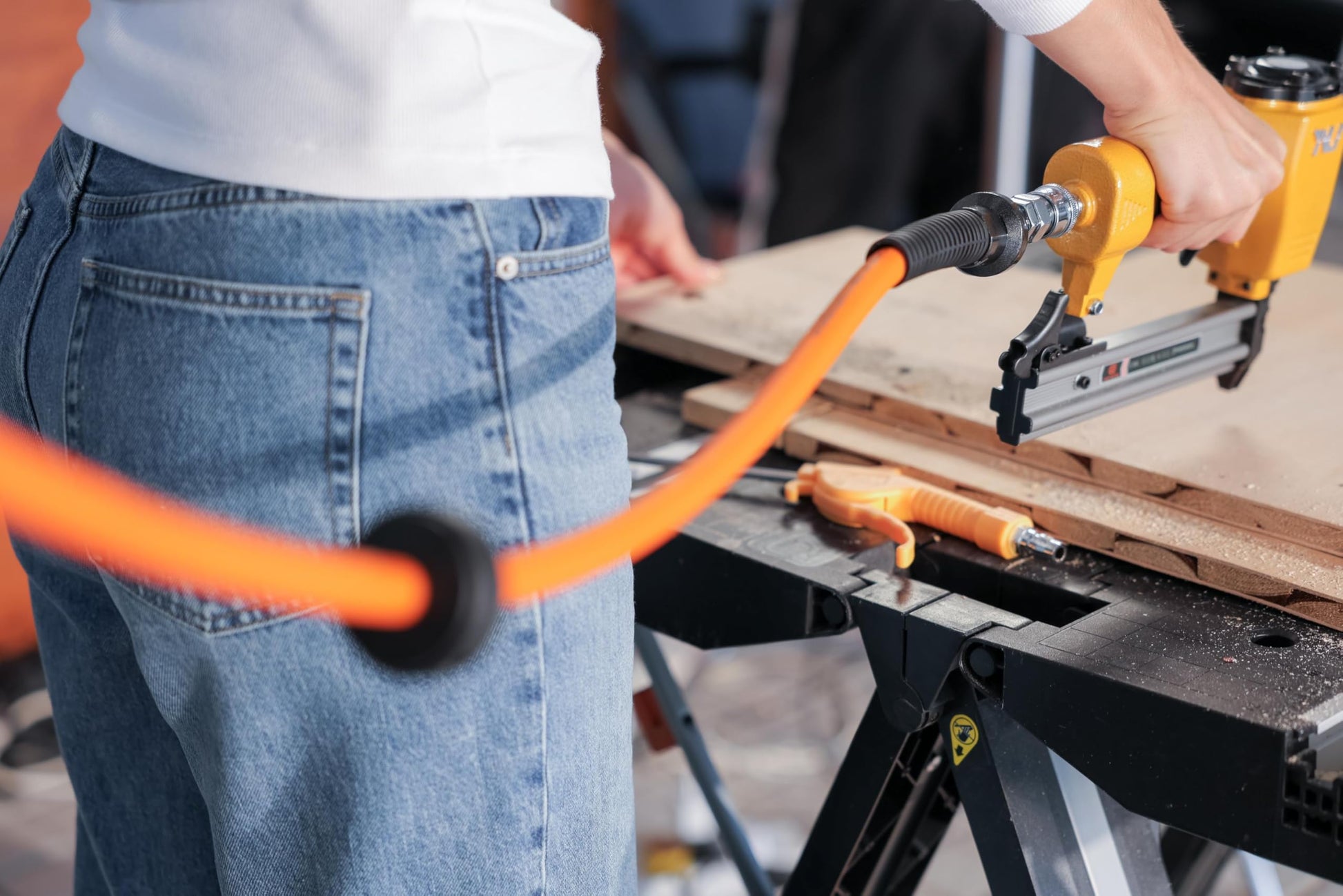 Sie können alle gängigen Druckluftwerkzeuge wie Schlagschrauber, Nagler oder Farbspritzpistolen anschliessen. Der Schlauch verfügt über eine standardmässige 1/4 Zoll Schnellkupplung und ist für einen maximalen Arbeitsdruck von 300 PSI (ca. 20 Bar) ausgelegt, was für die meisten Anwendungen in Werkstatt und Garage optimal ist.
