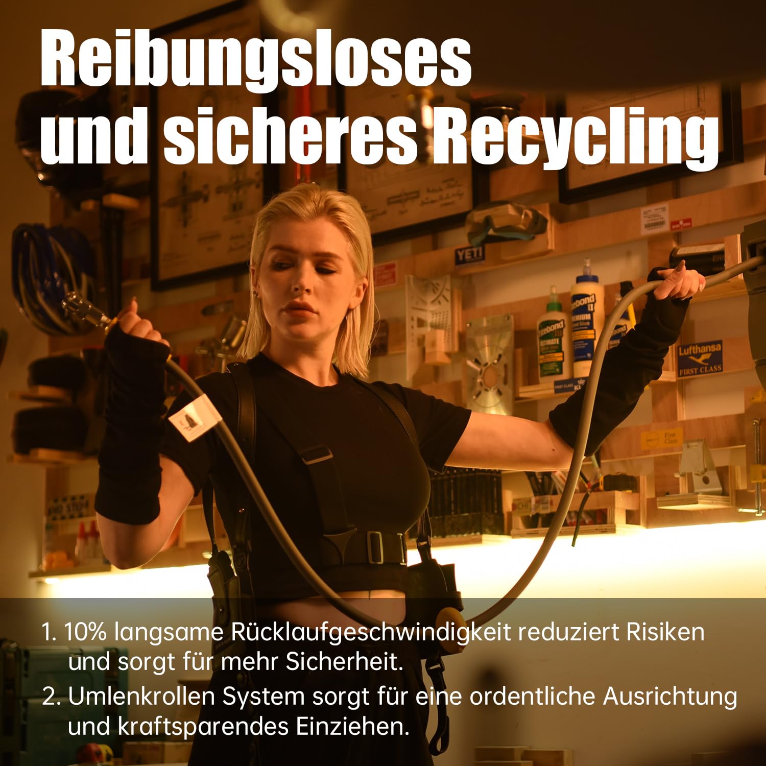 - Verhedderungsfreier Einzug: Ein kraftvoller Federmechanismus in Kombination mit einer Riemenscheibenführung rollt den Schlauch stets gleichmässig und sauber auf, ohne zu verknoten.