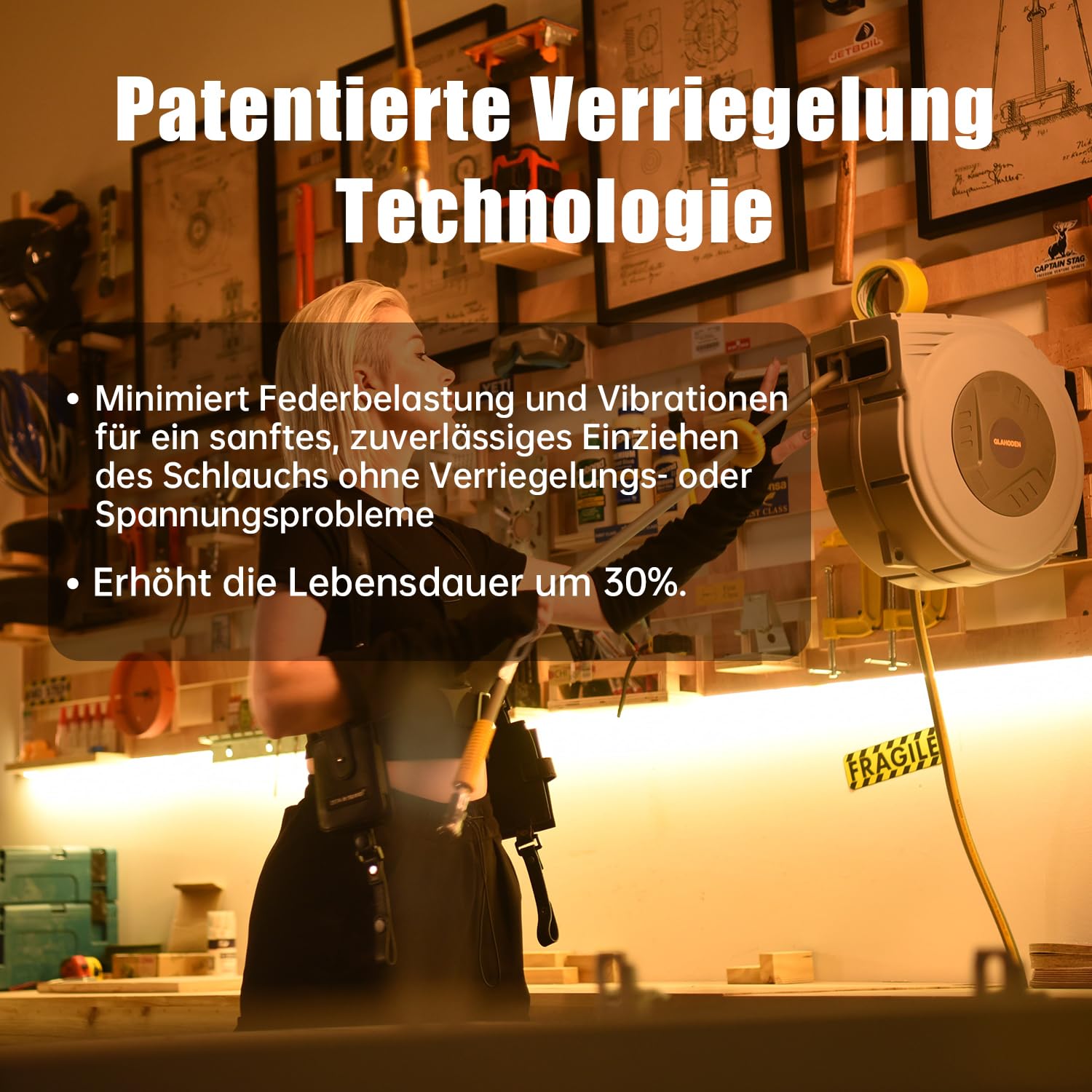 - Patentierte Automatikverriegelung: Eine zuverlässige, integrierte Arretierungs-Technologie stoppt den Schlauch an jeder gewünschten Länge und sorgt für eine um 30% erhöhte Lebensdauer.