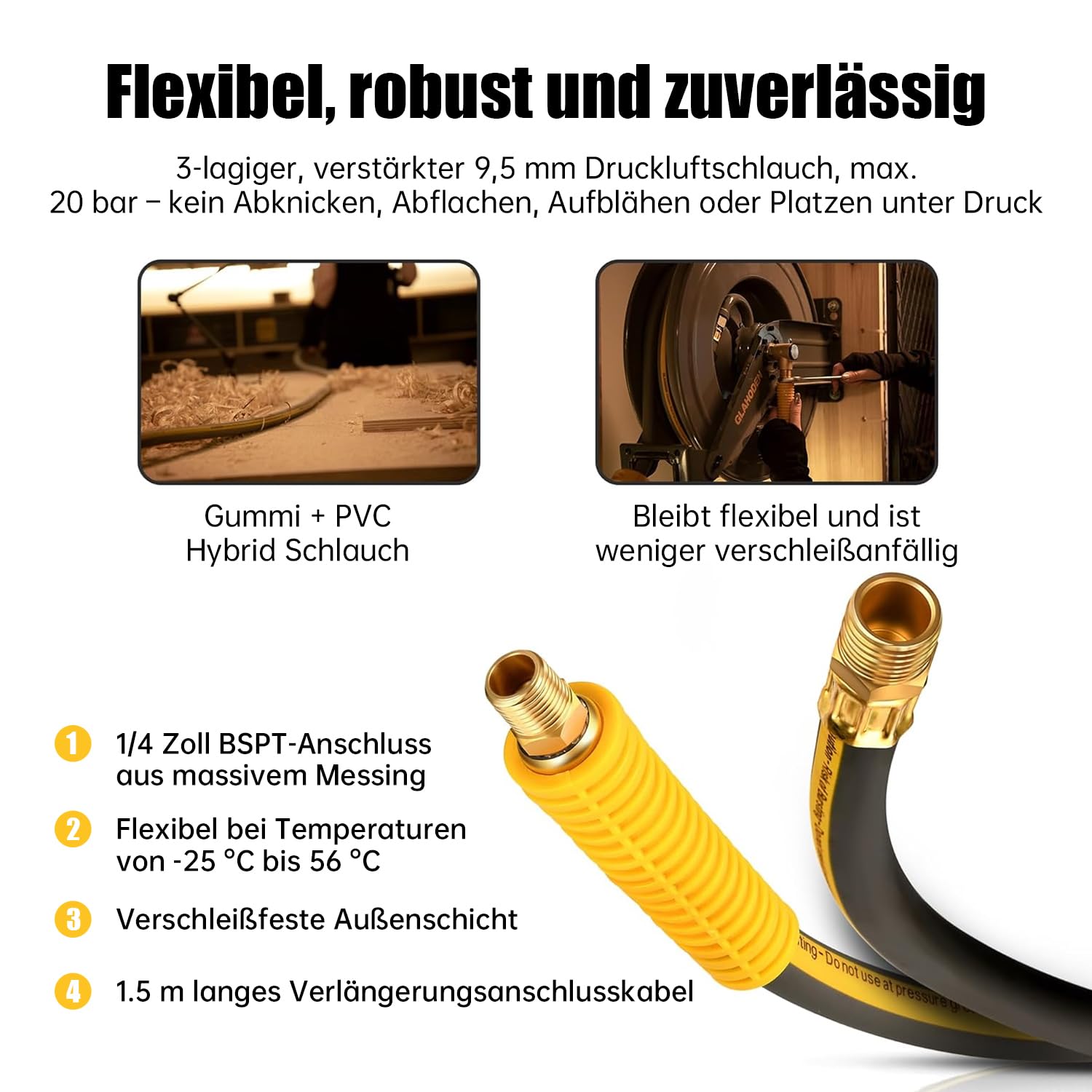 Schluss mit dem Schlauchchaos und Stolperfallen in Ihrer Werkstatt. Dank des automatischen Aufrollmechanismus ist Ihr Arbeitsplatz im Handumdrehen aufgeräumt und sicher. Der Schlauch ist immer einsatzbereit, wenn Sie ihn benötigen, und ebenso schnell wieder verstaut, was Ihre Arbeitsabläufe erheblich beschleunigt.