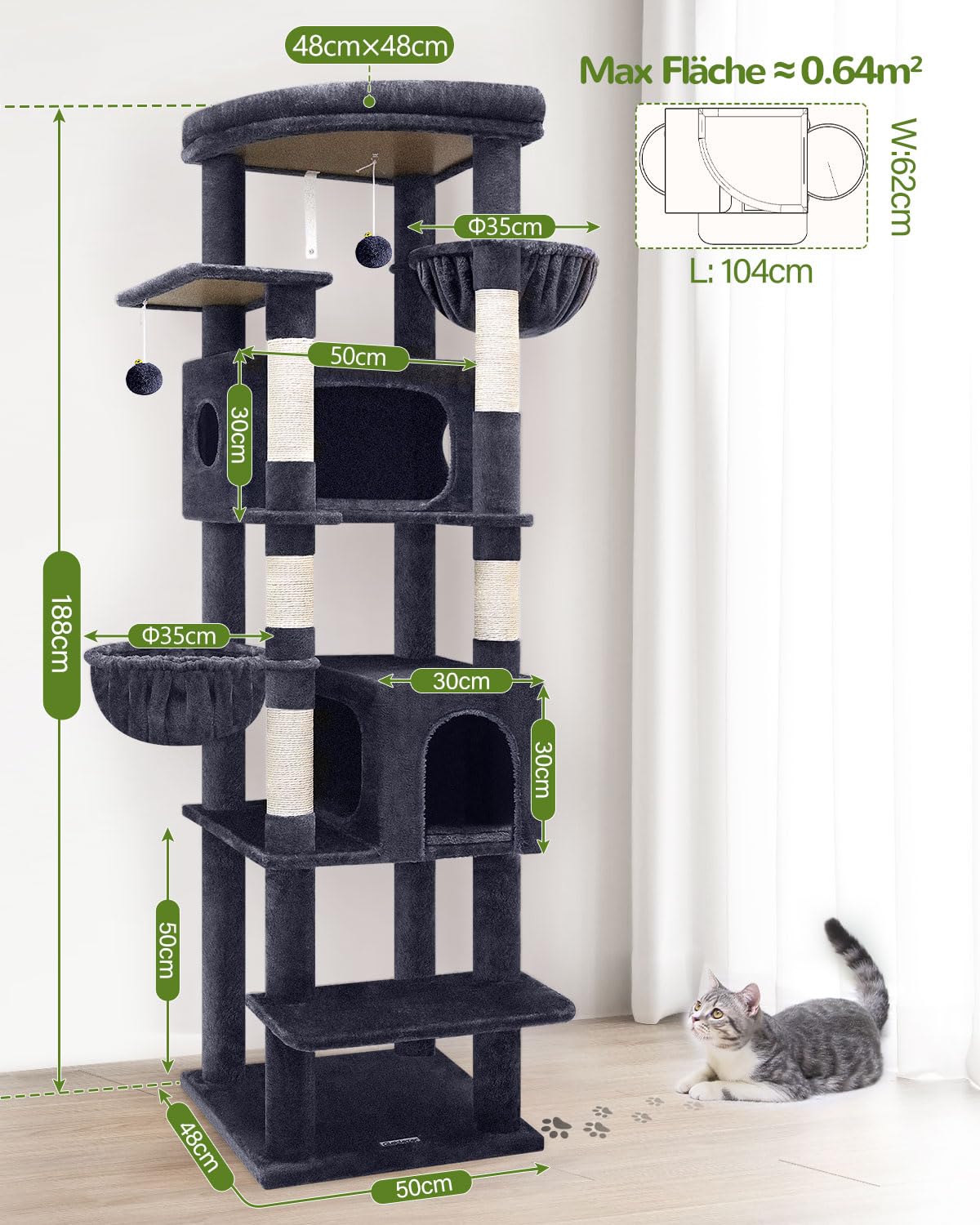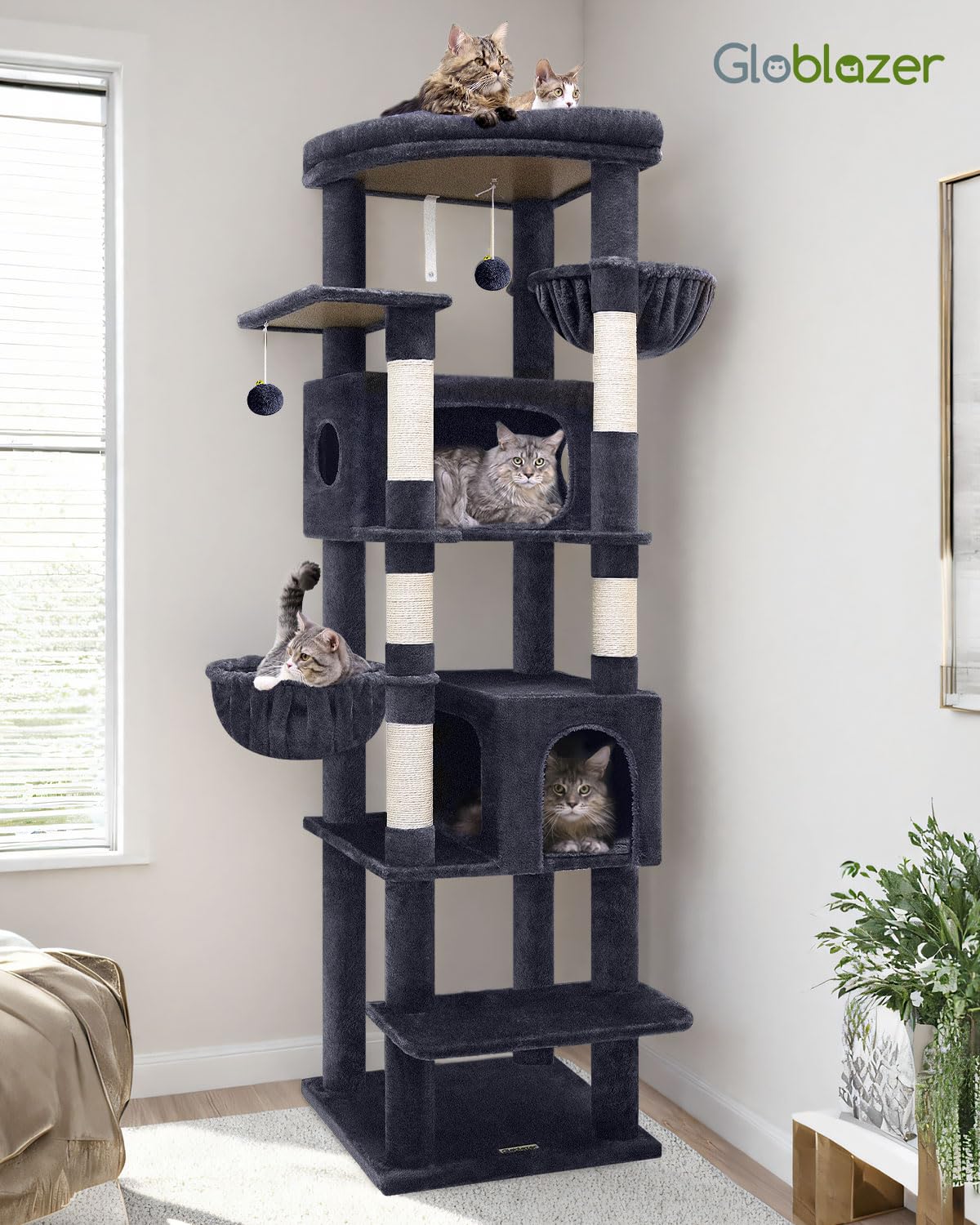Dieser stattliche, 188 cm hohe Kratzbaum von Globlazer wurde speziell für die Bedürfnisse grosser und schwerer Katzen entwickelt und bietet eine luxuriöse Spiel-, Kratz- und Ruhelandschaft in Dunkelgrau.