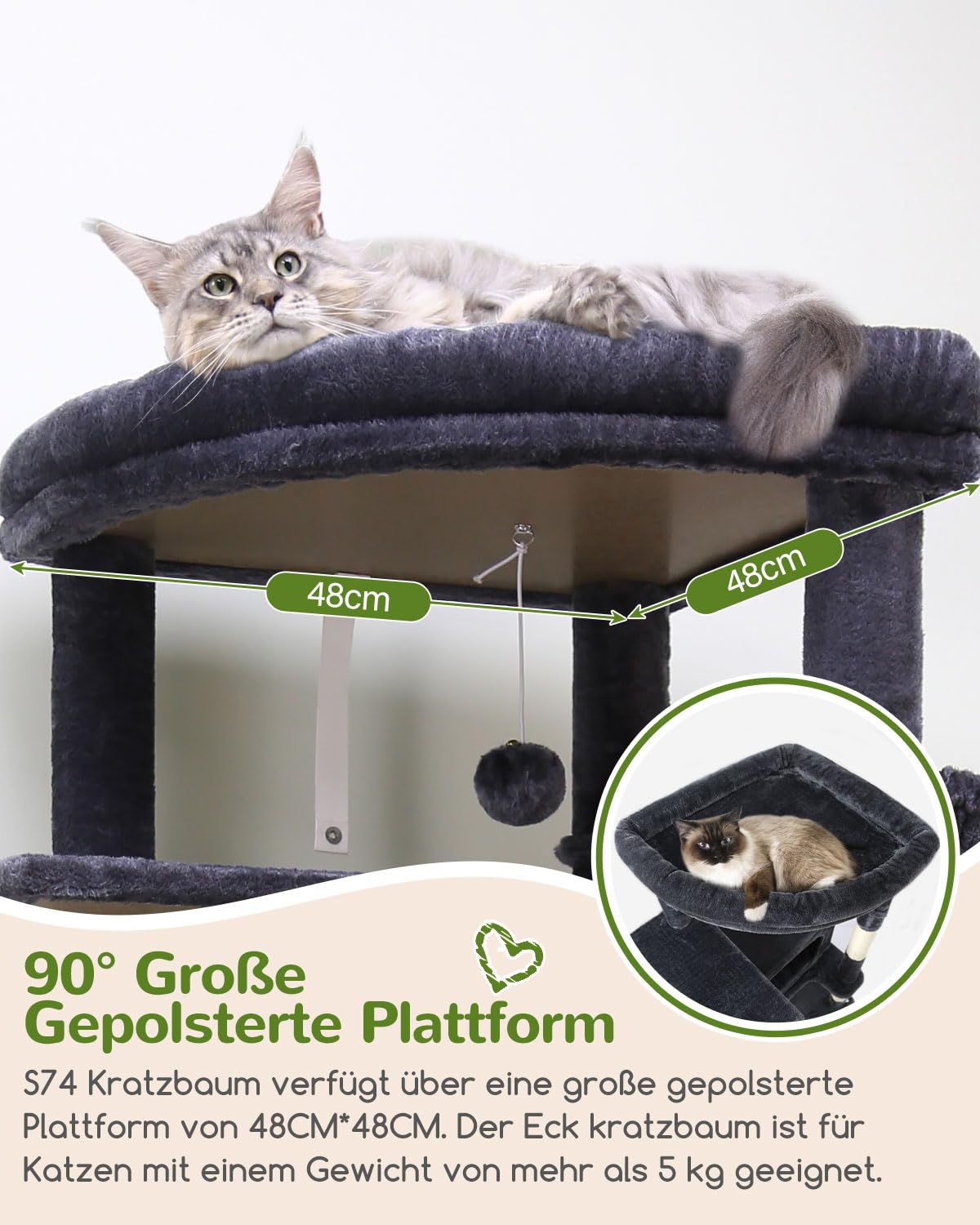 - Grosse Aussichtsplattform: Eine grosszügige, gepolsterte Liegefläche (50 x 50 cm) mit einem cleveren 90°-Design für Ecken, die die Nutzfläche um 67 % erweitert – perfekt für grosse Stubentiger.