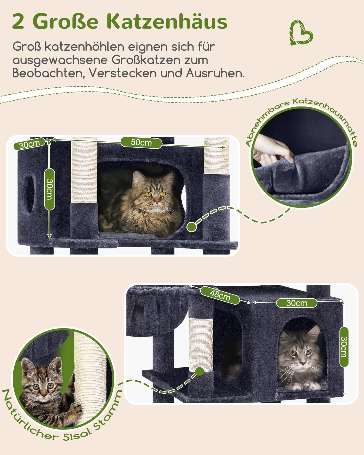 - Zwei geräumige Katzenhöhlen: Mit Massen von je 50 x 30 x 30 cm bieten sie rund 30 % mehr Platz als üblich und sind mit herausnehmbaren, weichen Plüschkissen ausgestattet.