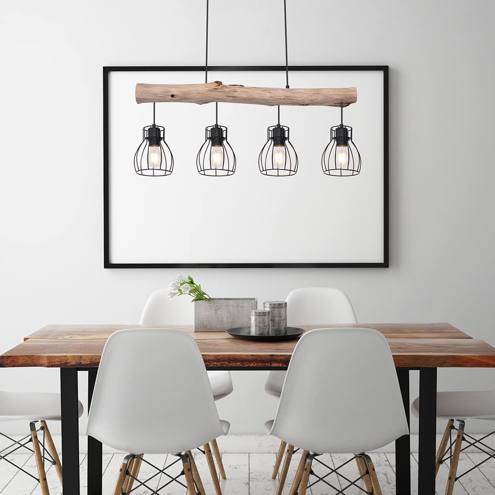 Dank ihres Materialmixes aus Echtholz und schwarzem Metall passt die Leuchte hervorragend in moderne, rustikale oder industrielle Wohnkonzepte. Sie eignet sich perfekt als zentrales Gestaltungselement über einem Esstisch, einer Kücheninsel oder einer Theke.