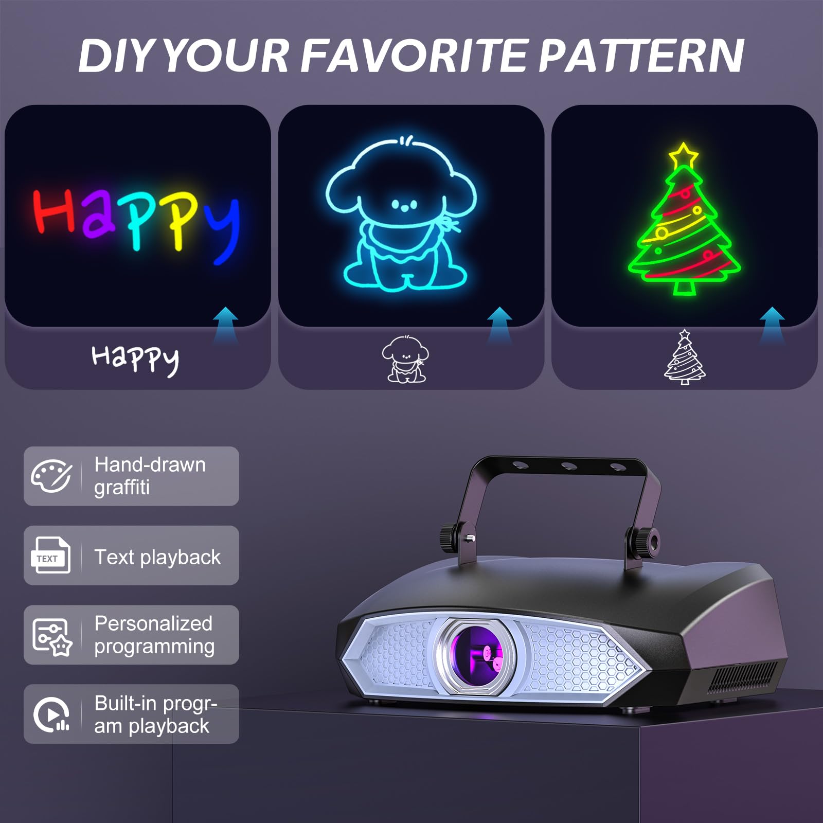 Ja, das ist die Kernfunktion! Mit der App „LIGHT ELF“ können Sie eigene Muster mit bis zu 800 Punkten zeichnen, einfache Bilder hochladen oder Texte mit bis zu 100 Zeichen schreiben. Ihre Kreationen, wie z.B. Firmenlogos oder Partymottos, können Sie als Favoriten speichern und jederzeit wieder abrufen.