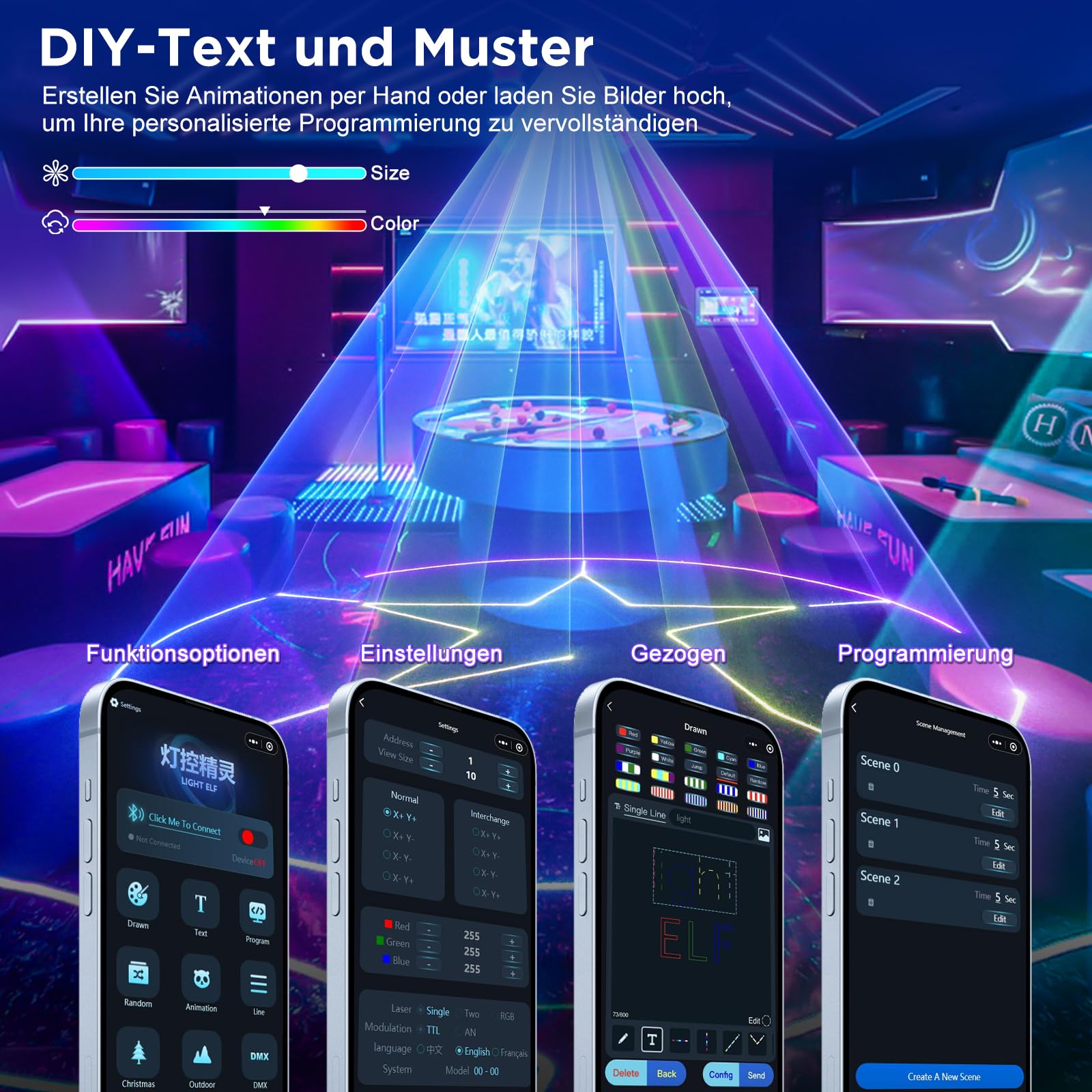 - Kreative DIY-Animationen: Gestalten Sie über die „LIGHT ELF“-App mühelos eigene Muster mit bis zu 800 Punkten, laden Sie einfache Bilder hoch oder verfassen Sie Texte mit bis zu 100 Zeichen. Für einen eindrucksvollen 3D-Effekt lässt sich das Licht ideal mit einer Nebelmaschine kombinieren.