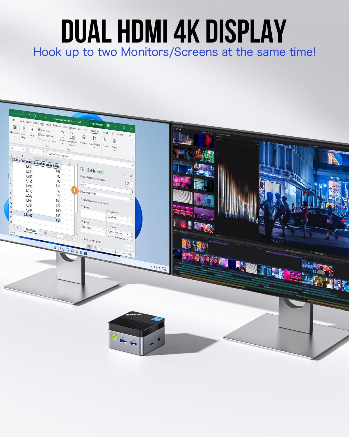 Ja, der Mini-PC verfügt über zwei HDMI-Anschlüsse, die den gleichzeitigen Betrieb von zwei Monitoren mit einer gestochen scharfen 4K UHD-Auflösung (4096 x 2160 @ 60 Hz) unterstützen. Das ist ideal, um Ihre Arbeitsfläche zu verdoppeln und die Produktivität zu steigern.