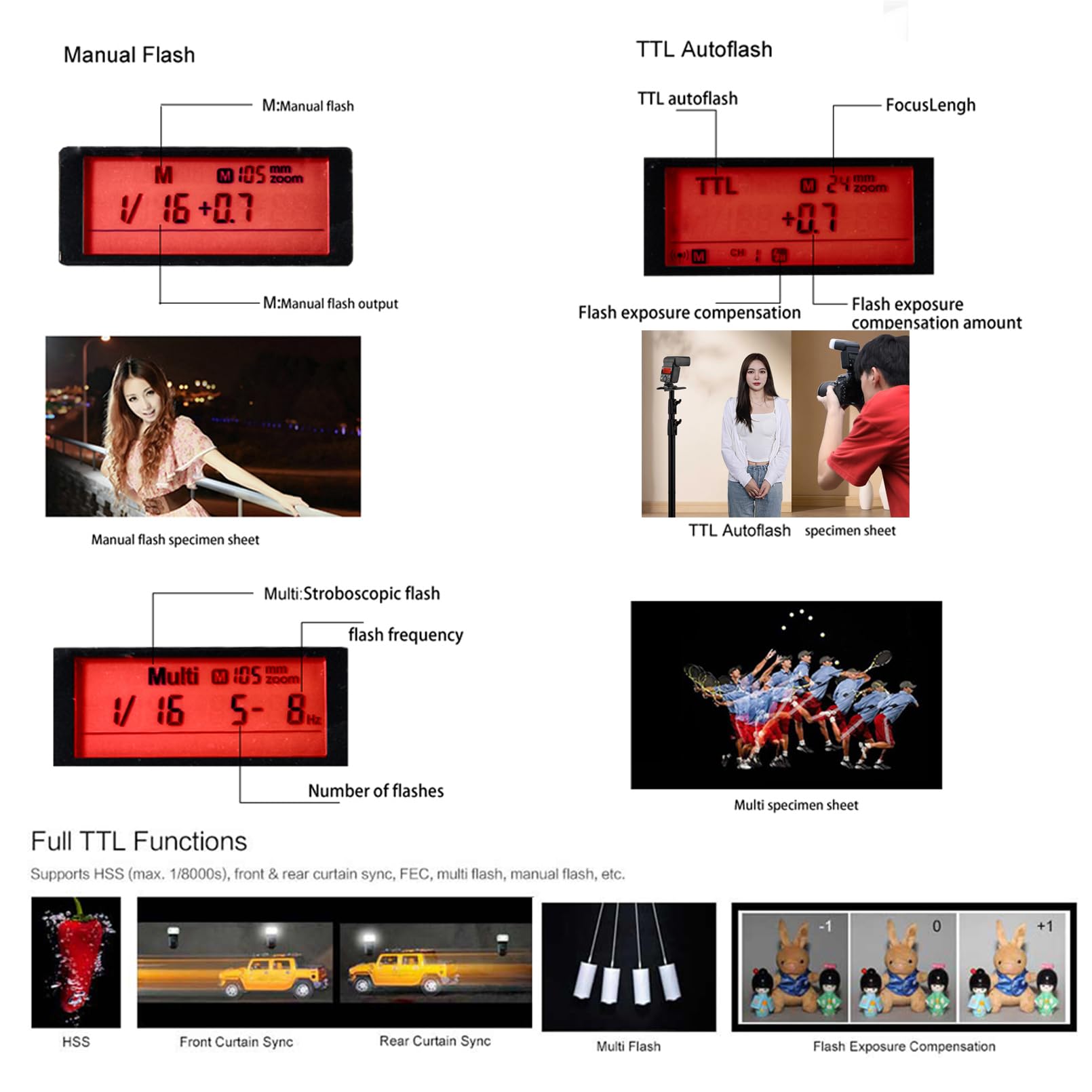 - Vielseitige Blitzmodi: Das Gerät bietet volle Unterstützung für TTL, Manuell (M), S1/S2 sowie High-Speed Sync (HSS) bis zu 1/8000s, Blitzbelichtungskorrektur (FEC) und Synchronisation auf den ersten oder zweiten Verschlussvorhang.