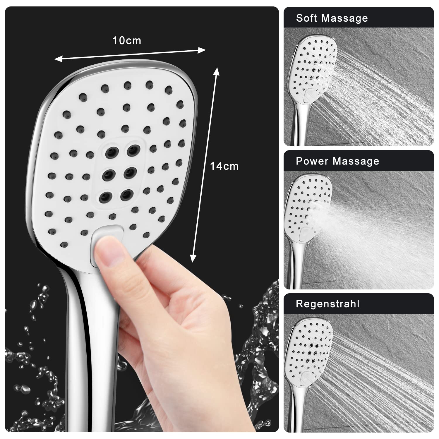 - Multifunktionale Handbrause: Wählen Sie per Knopfdruck zwischen drei angenehmen Strahlarten: erfrischender Regen, kräftige Power-Massage oder sanfte Soft-Massage.