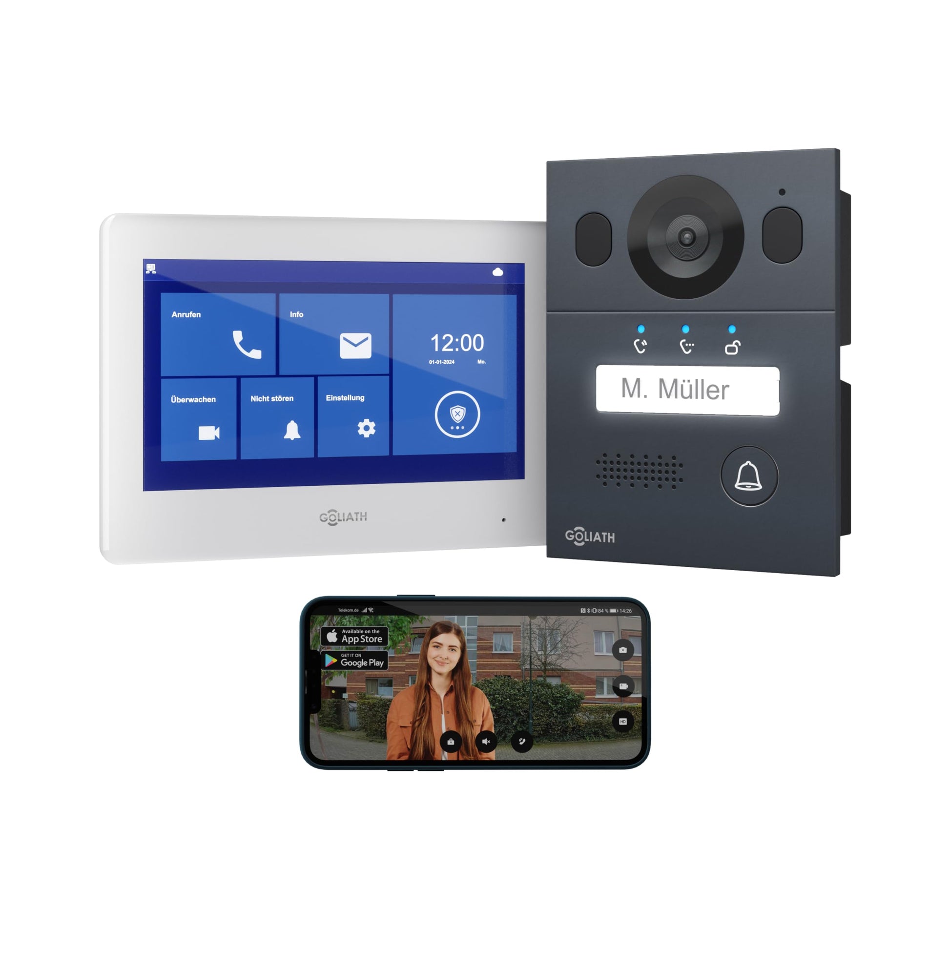 Mit der Goliath Video-Türsprechanlage haben Sie jederzeit im Blick, wer vor Ihrer Türe steht, und können bequem per Monitor oder Smartphone kommunizieren. Diese Anlage vereint moderne Sicherheitstechnik mit hohem Bedienkomfort für Ihr Zuhause.