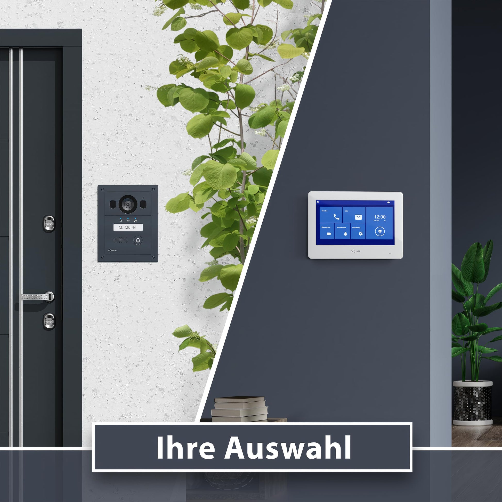 Das Komplettset beinhaltet alles, was Sie für eine schnelle Inbetriebnahme benötigen: eine Innenstation mit einem 7-Zoll-Full-Touchscreen-Monitor, eine Aussenstation mit Kamera und beleuchtetem Namensschild, ein Netzteil, ein BUS-Modul sowie einen Verteiler.