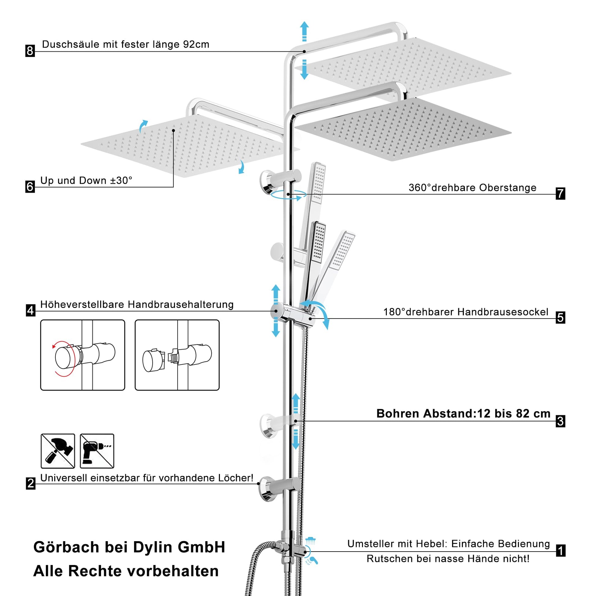 Das Duschsystem ist aus hochwertigen und langlebigen Materialien gefertigt. Die Duschstange, die 30x30 cm grosse Kopfbrause und die Schläuche bestehen aus Edelstahl mit einer kratzfesten Chromoberfläche. Der Umsteller ist aus massivem Messing. Die Anti-Kalk-Düsen an beiden Brausen erleichtern die Reinigung erheblich und sorgen für eine lange Lebensdauer.