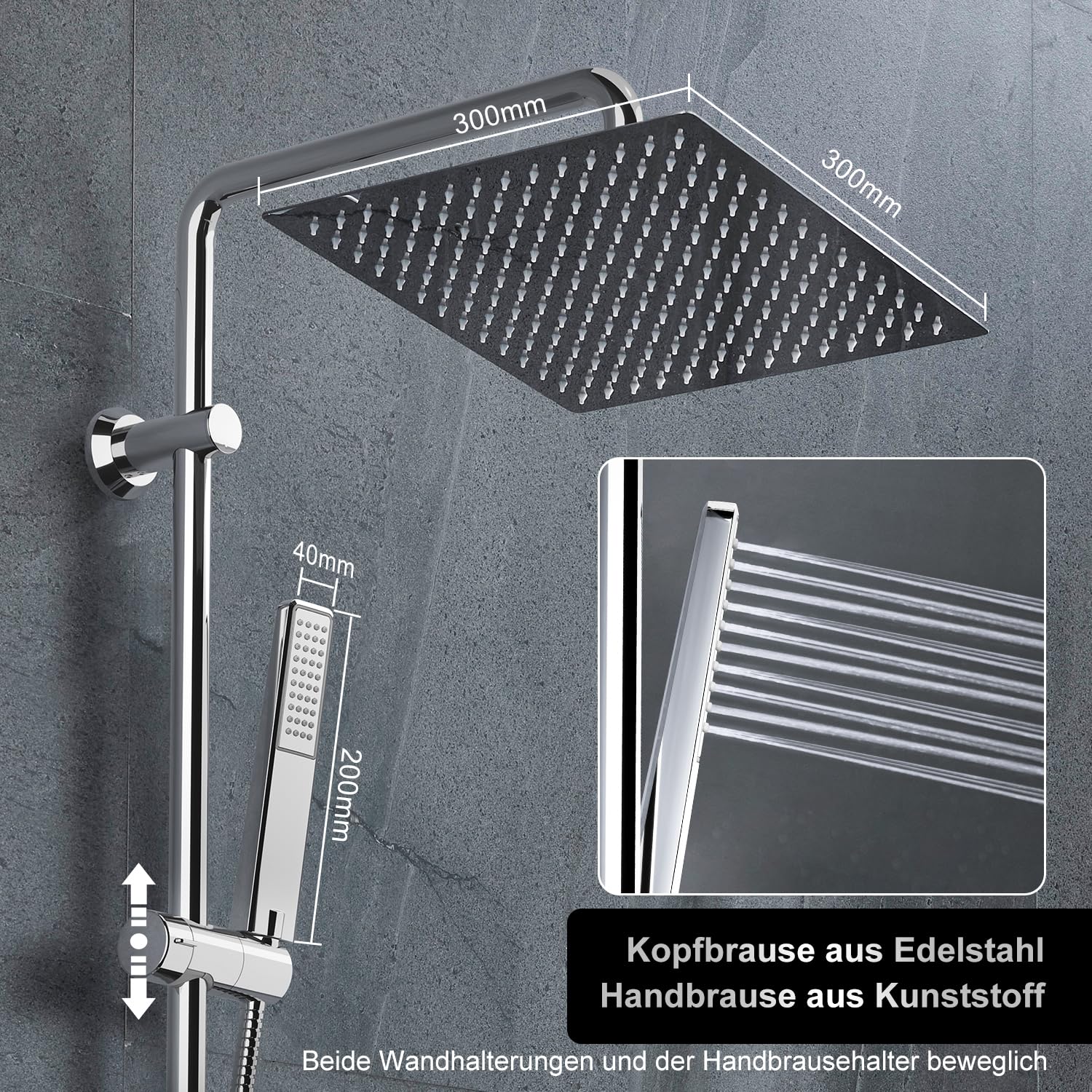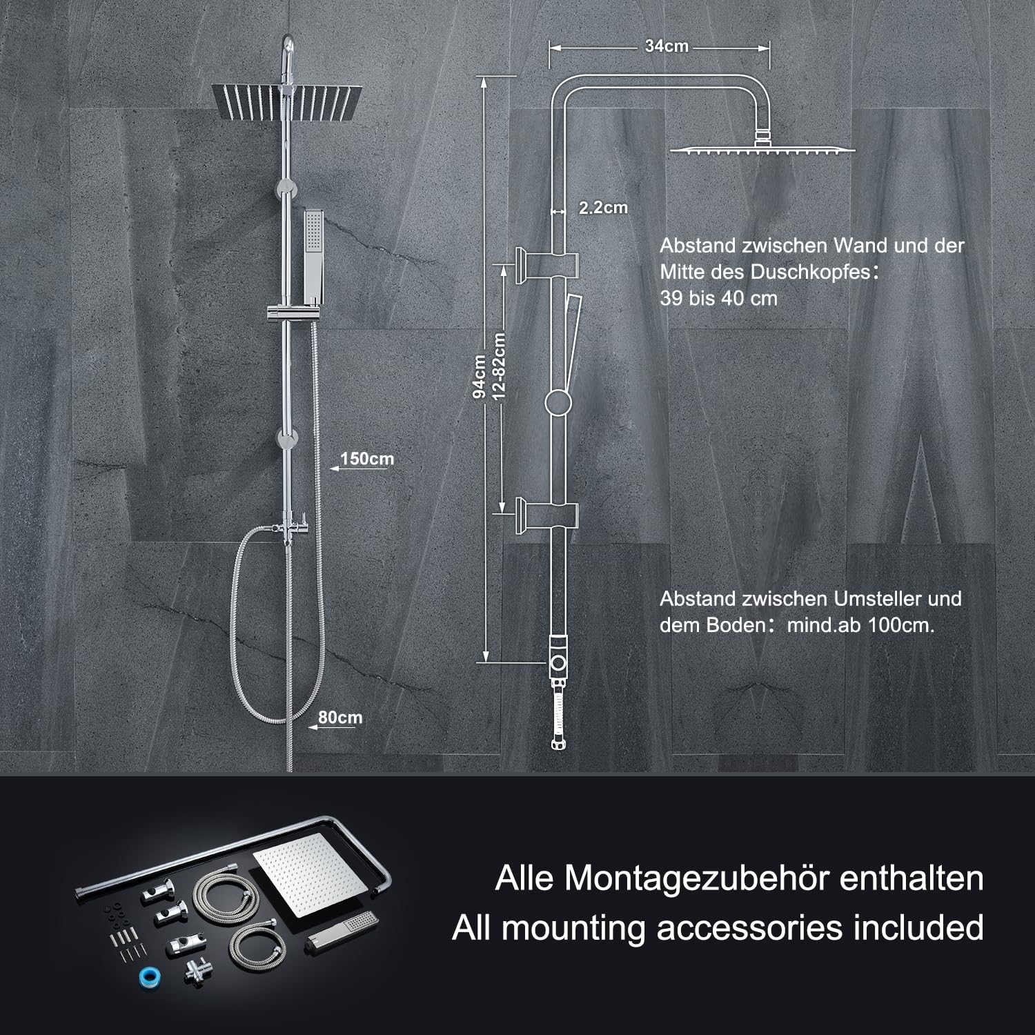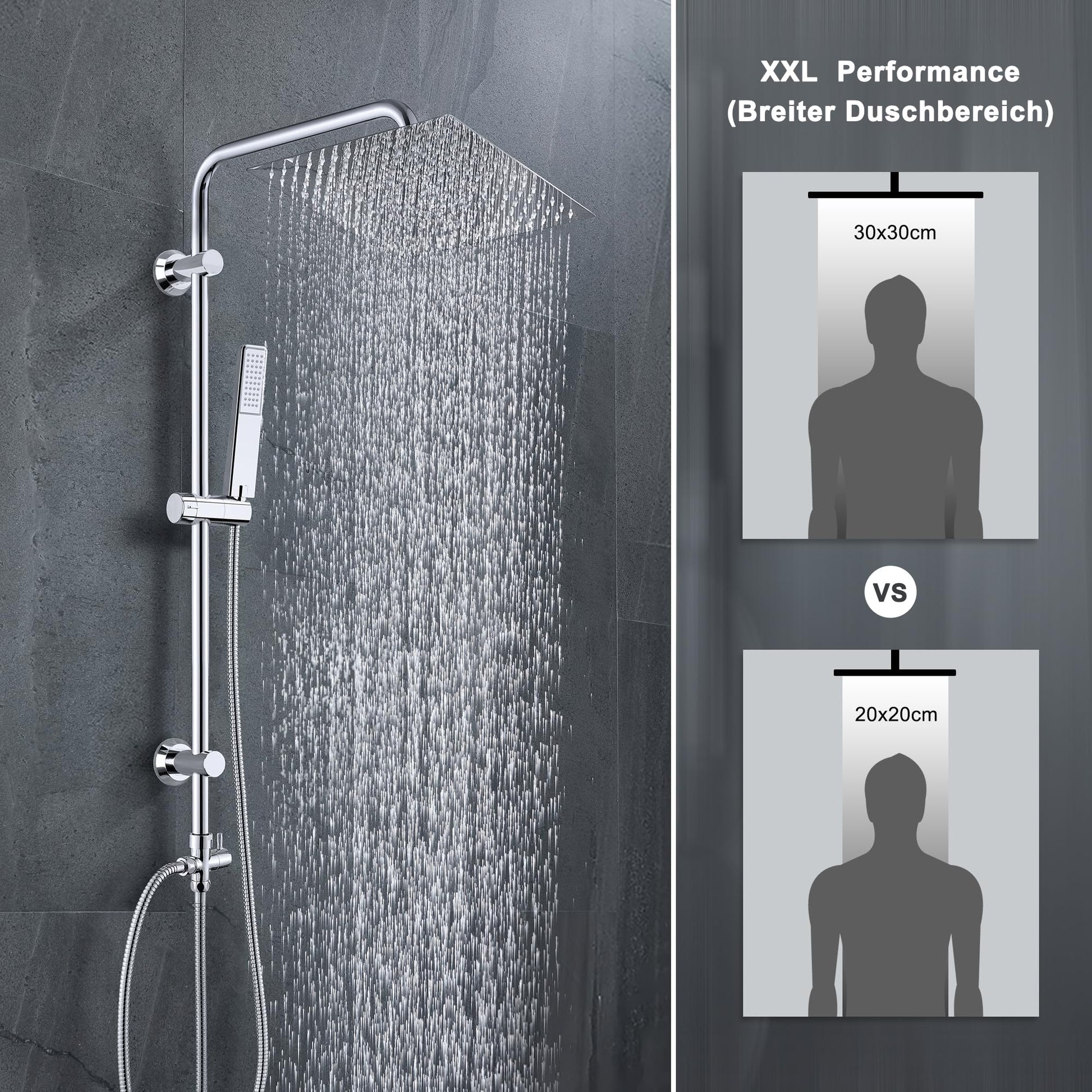Die XXL-Kopfbrause misst 30x30 cm. Die Duschstange hat eine Länge von 92 cm und einen Durchmesser von 22 mm. Der mitgelieferte Brauseschlauch zur Handbrause ist 150 cm lang, der Anschlussschlauch zur Armatur misst 80 cm.