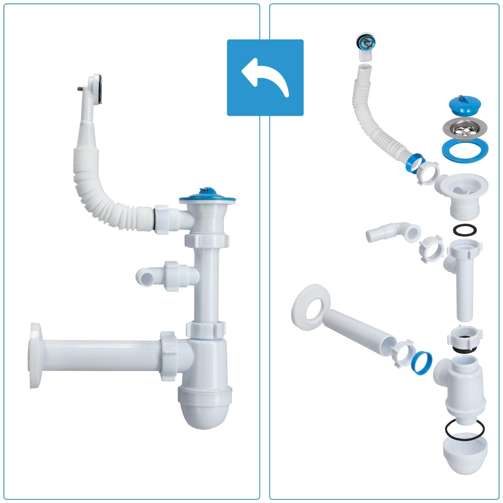 - Integrierter Geruchsschutz: Der mitgelieferte Siphon verfügt über einen Wasserverschluss, der zuverlässig unangenehme Gerüche aus dem Abfluss verhindert und vor Verstopfungen schützt.