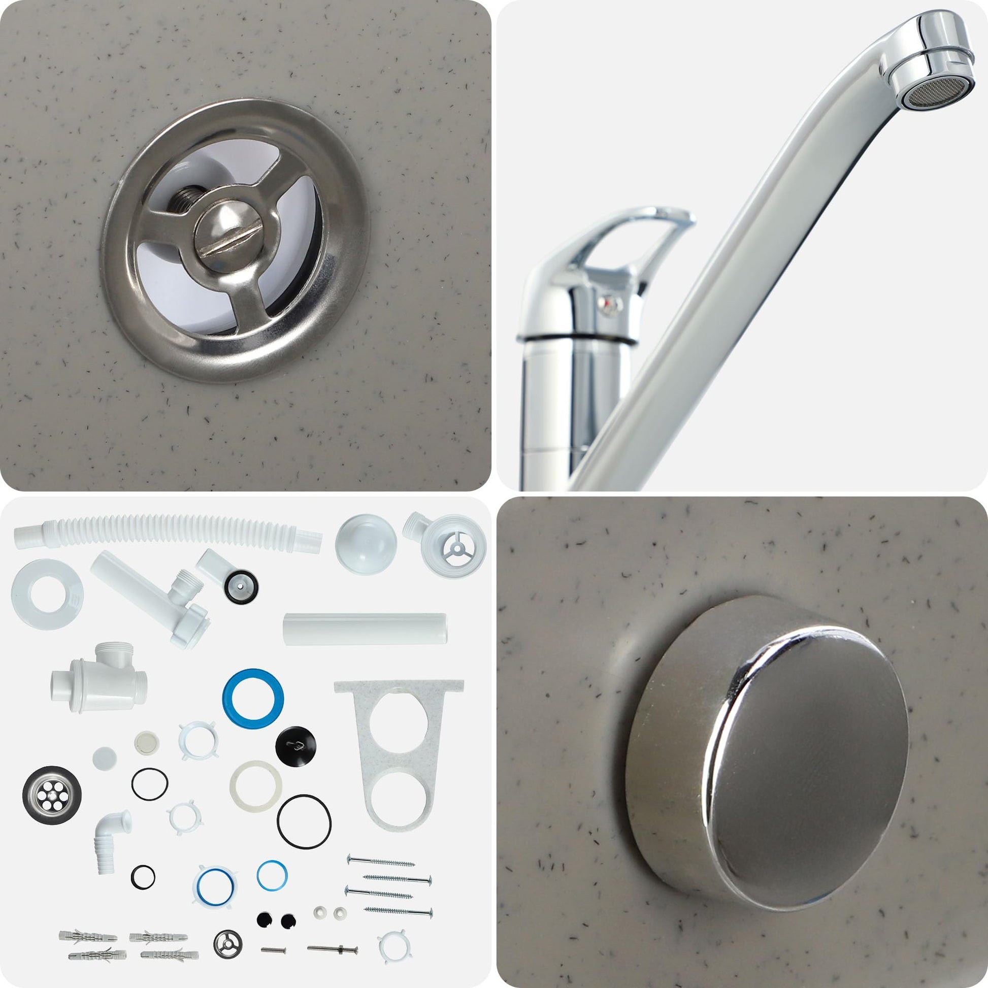 Das Set ist eine Komplettlösung und beinhaltet das Polypropylen-Becken, eine funktionale Armatur mit schwenkbarem Auslauf, einen passenden Siphon mit integriertem Geruchsschutz sowie das gesamte Montagematerial für die Installation.