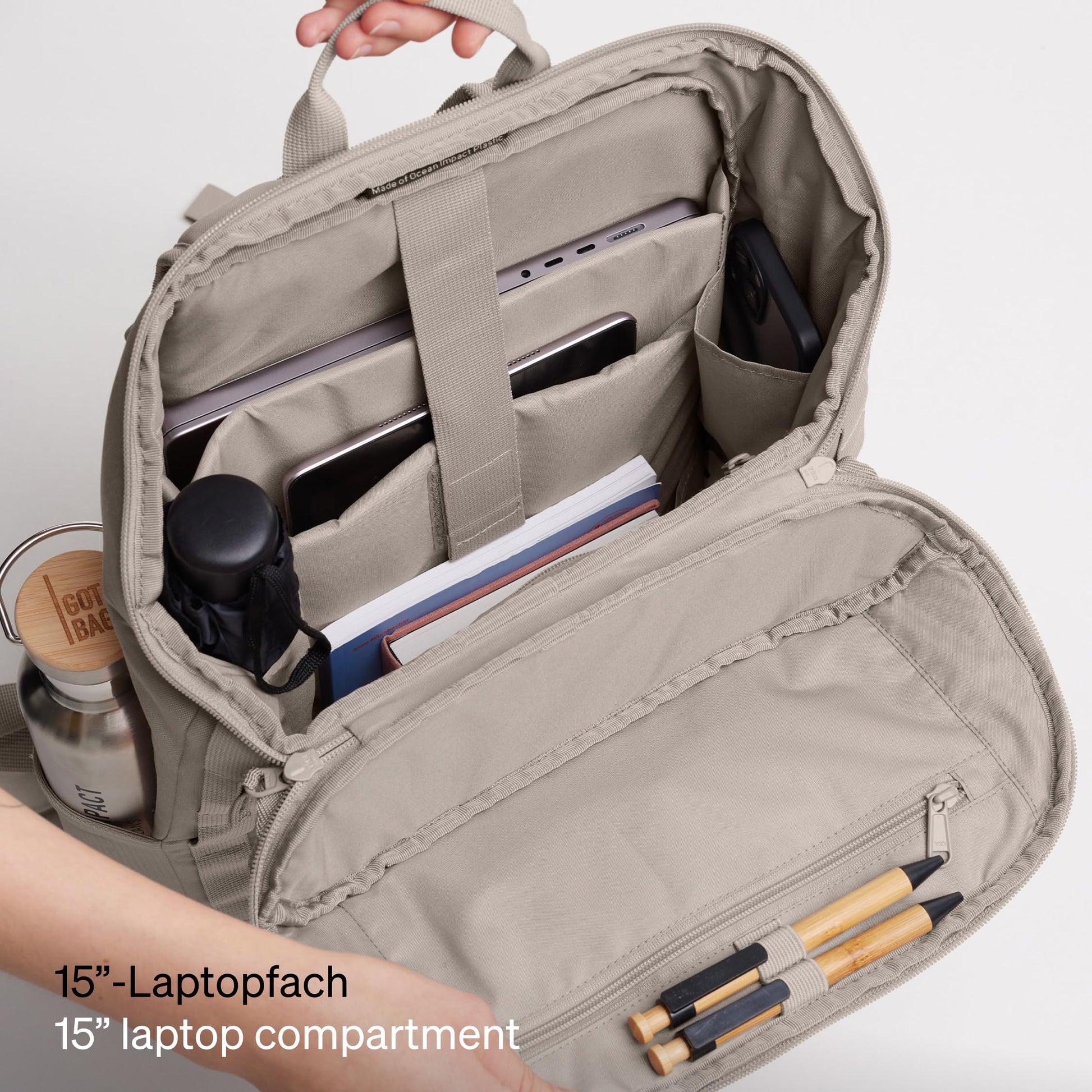 Der PRO PACK ist der ideale Rucksack für alle, die im Arbeits- oder Unialltag Wert auf Organisation, Komfort und Nachhaltigkeit legen. Er verbindet ein durchdachtes Design mit einem Material, das aktiv zur Säuberung unserer Ozeane beiträgt.