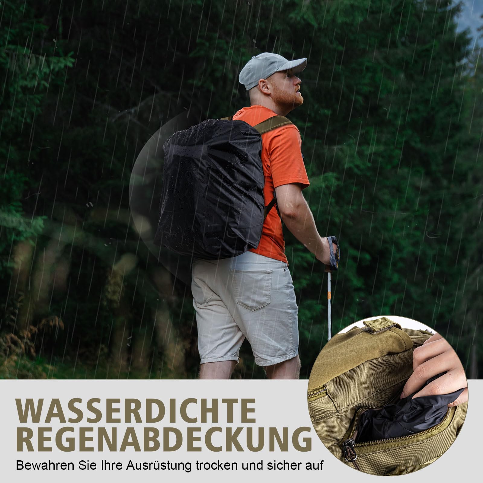 Der Rucksack besteht aus robustem, wasserabweisendem 900D Oxford-Gewebe, das Ihre Ausrüstung vor Spritzwasser und leichtem Regen schützt. Für vollständigen Schutz bei starkem Niederschlag ist zusätzlich eine integrierte Regenhülle im Lieferumfang enthalten.