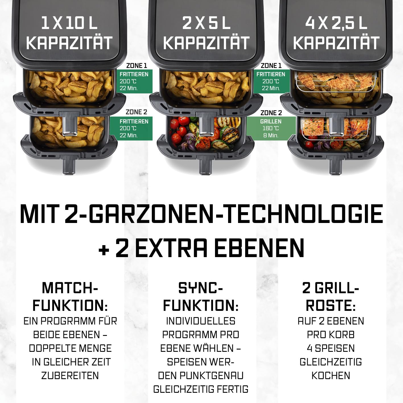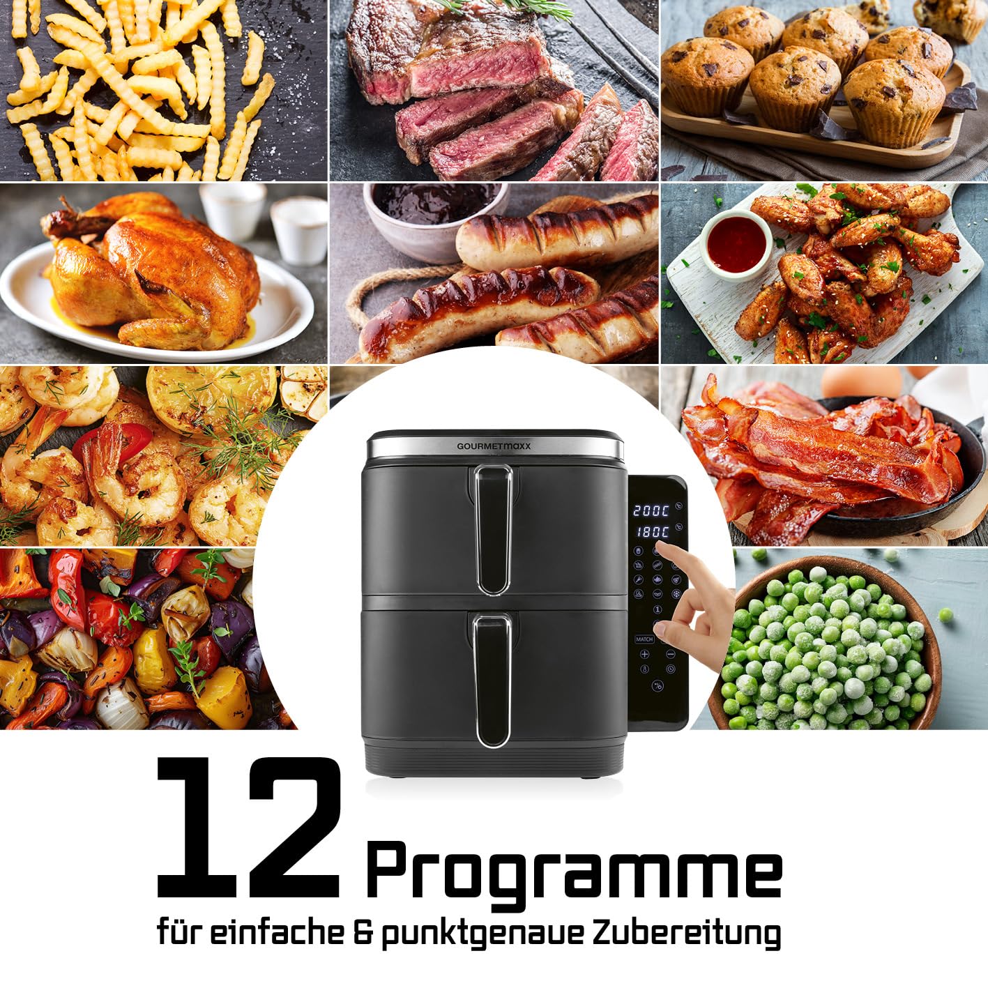 - Intelligente Steuerung: SYNC & MATCH-Funktion zur Synchronisation der Garzeiten oder Verdoppelung der Menge.
