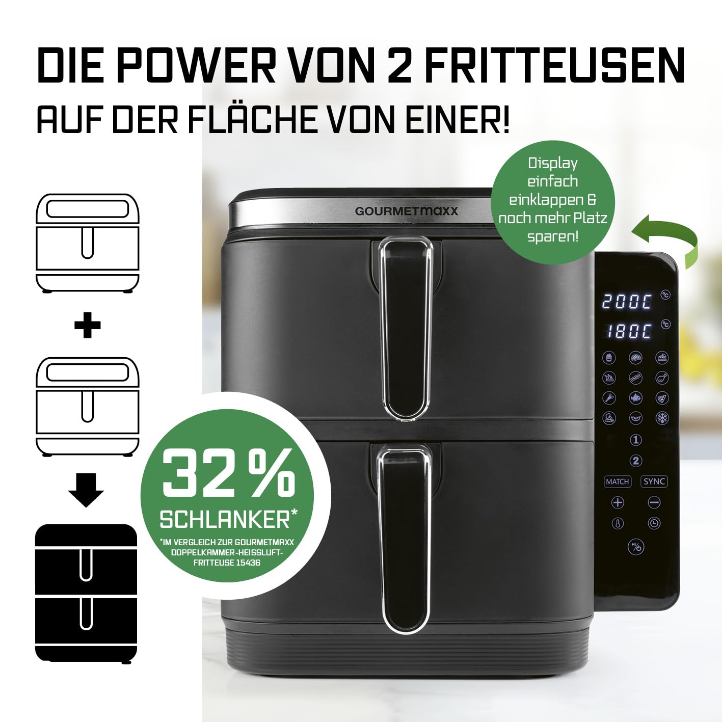 Was macht diese Doppelkammer-Heissluftfritteuse so besonders platzsparend?