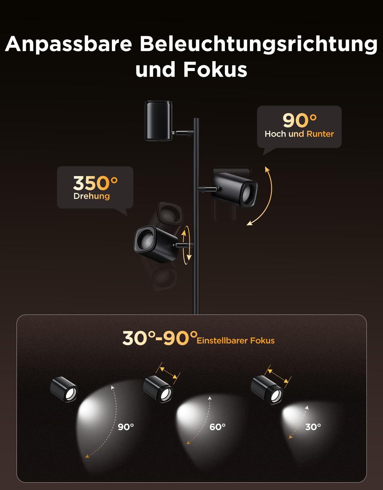 - Flexible 3-Kopf-Steuerung: Jeder der drei Lampenköpfe lässt sich unabhängig justieren. Die Arme sind horizontal um 350° und vertikal um 90° schwenkbar, während der Lichtkegel von 30° bis 90° für eine präzise Ausleuchtung einstellbar ist.