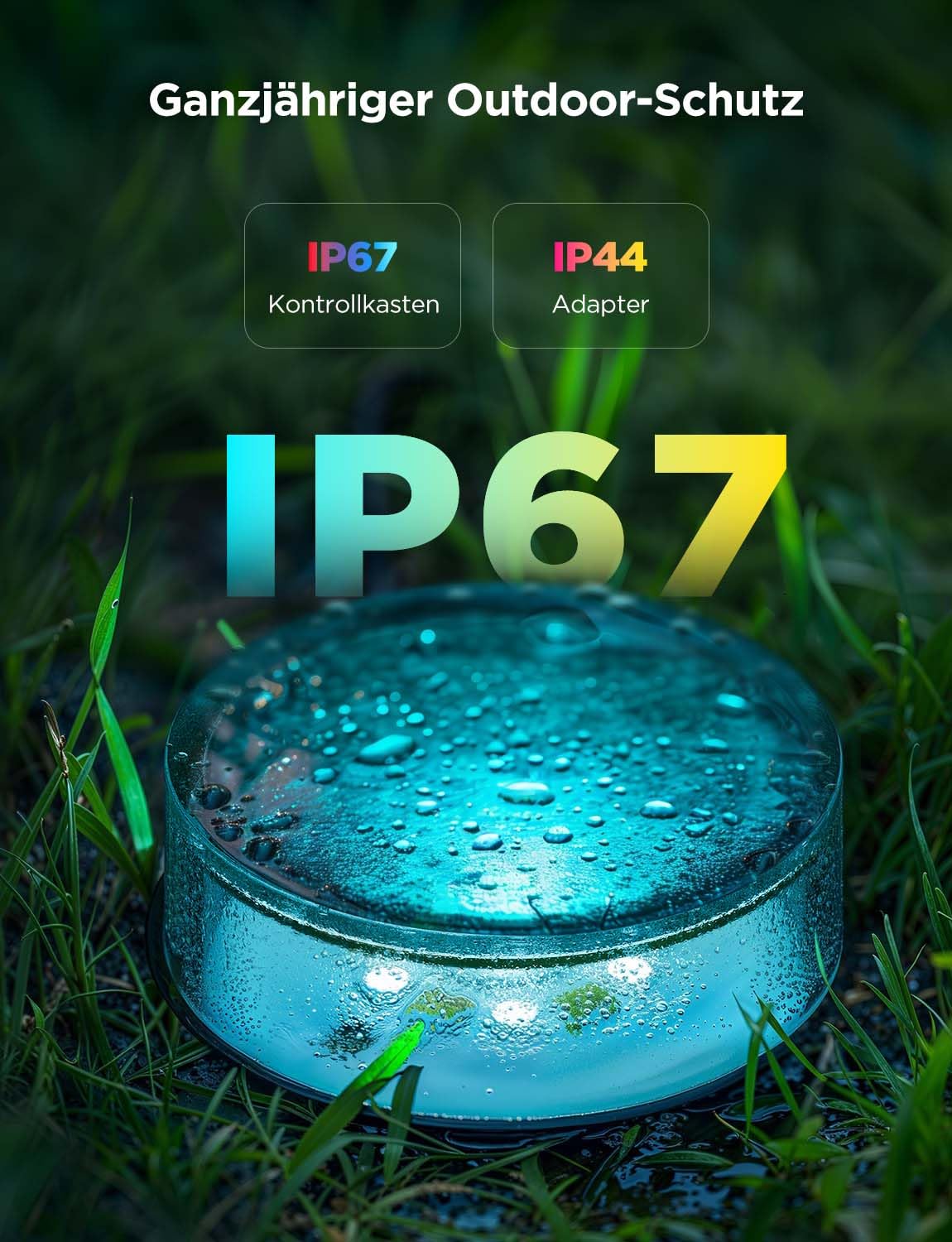 - Robuster Ganzjahresschutz: Dank der IP67-Zertifizierung für Leuchten und Netzteil sowie der IP44-geschützten Steuerbox sind diese Bodenstrahler für den Einsatz bei jedem Wetter konzipiert und äusserst langlebig.