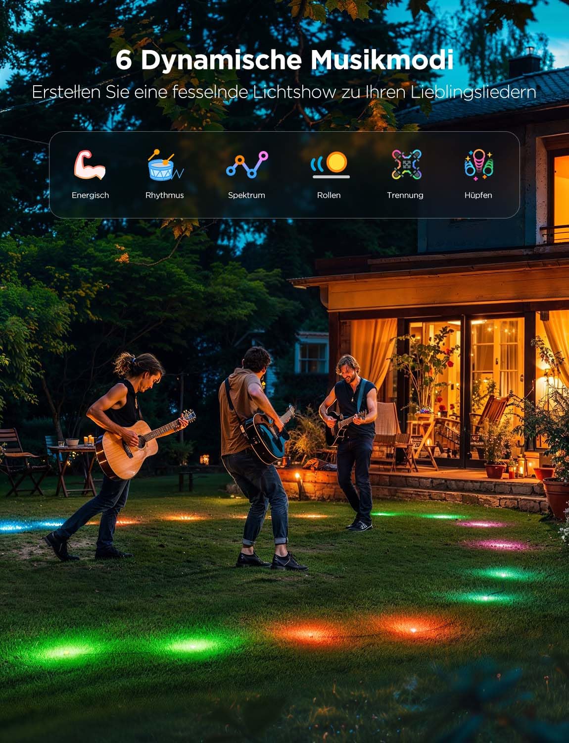 - Synchronisation mit Musik: Lassen Sie Ihre Beleuchtung im Rhythmus Ihrer Musik tanzen. Der integrierte Modus passt die Lichteffekte dem Takt an und sorgt so für die perfekte Stimmung auf jedem Gartenfest.