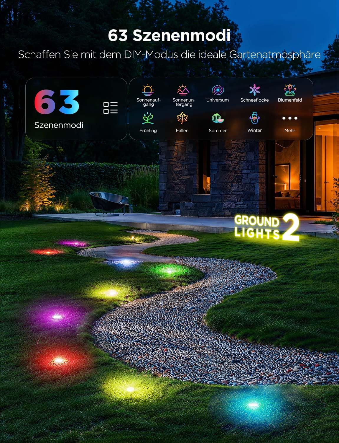 - Dynamische Farbwelten (RGBIC): Dank der fortschrittlichen RGBIC-Technologie kann jede Leuchte individuell angesteuert werden. Wählen Sie aus 16 Millionen Farben und 63 voreingestellten Szenenmodi, um einzigartige Lichteffekte zu kreieren.