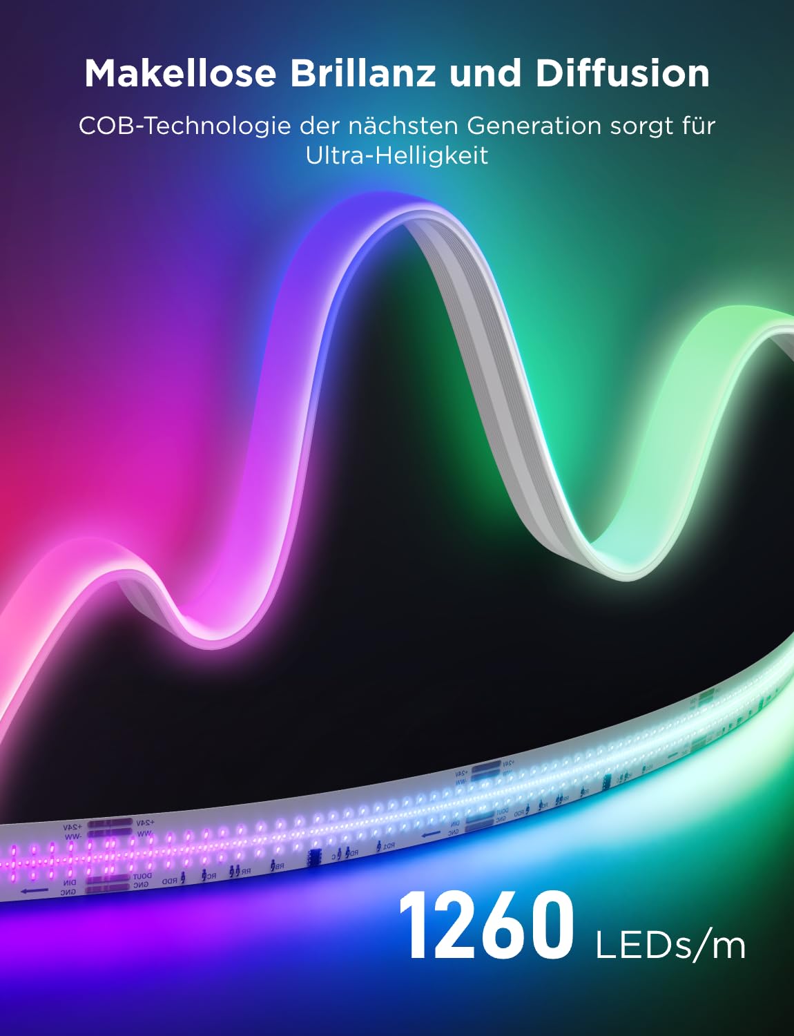 - Fortschrittliche COB-Technologie: Dank der integrierten Verpackungstechnologie und einer extrem hohen Dichte von 1260 LEDs pro Meter erzeugt der Streifen ein absolut gleichmässiges und fliessendes Lichtband ohne sichtbare Lichtpunkte.