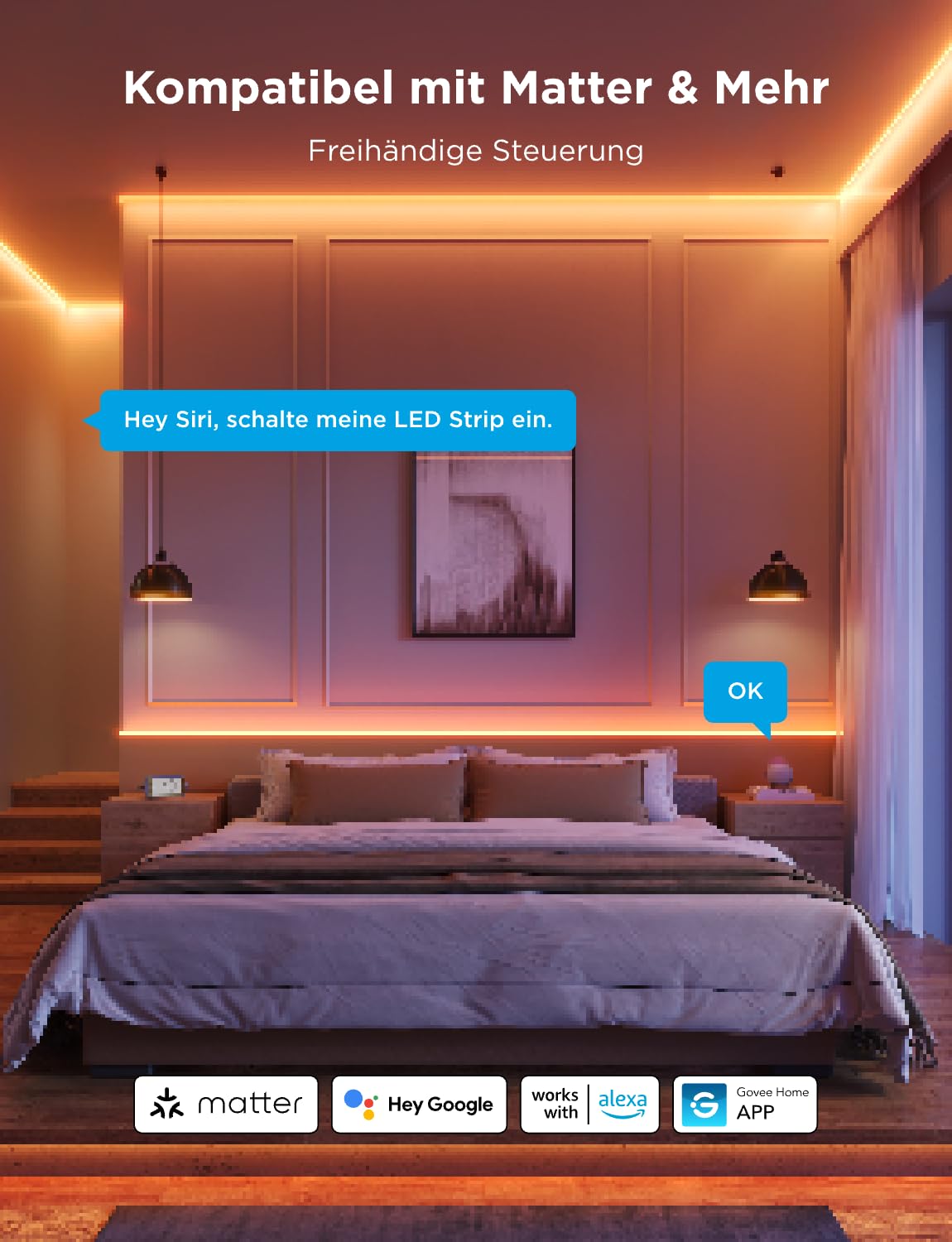 - Umfassende Smart-Home-Integration: Dank Matter-Zertifizierung lässt sich der LED-Streifen mühelos mit allen gängigen Plattformen wie Apple HomeKit, Alexa oder Google Assistant verbinden und bequem per Sprachbefehl steuern.