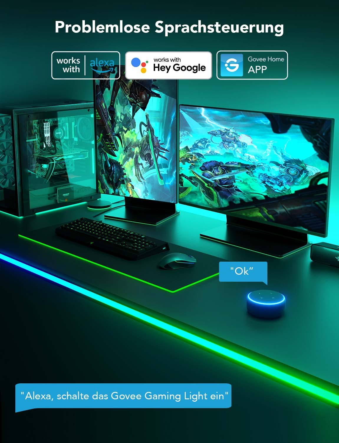 - Intelligente Steuerung: Einfache Bedienung per Sprachbefehl über Alexa und Google Assistant oder via Govee Home App mit Zugriff auf 16 Millionen Farben, über 64 Szenenmodi und 11 Musikmodi.