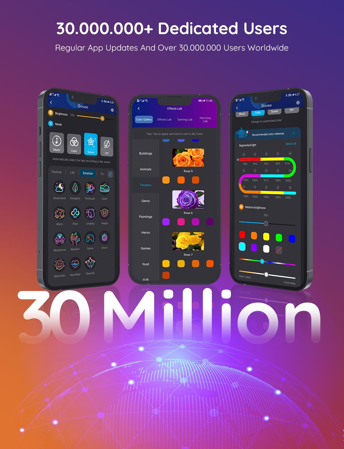 - Umfassende App-Steuerung: Die Govee Home App eröffnet Ihnen eine Welt voller kreativer Möglichkeiten, inklusive DIY-Modi, von der Community erstellten Effekten und KI-gestützten Farbthemen, die aus Ihren eigenen Fotos generiert werden.