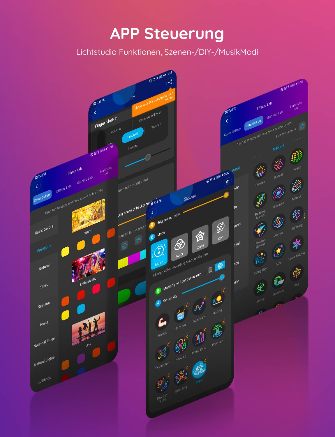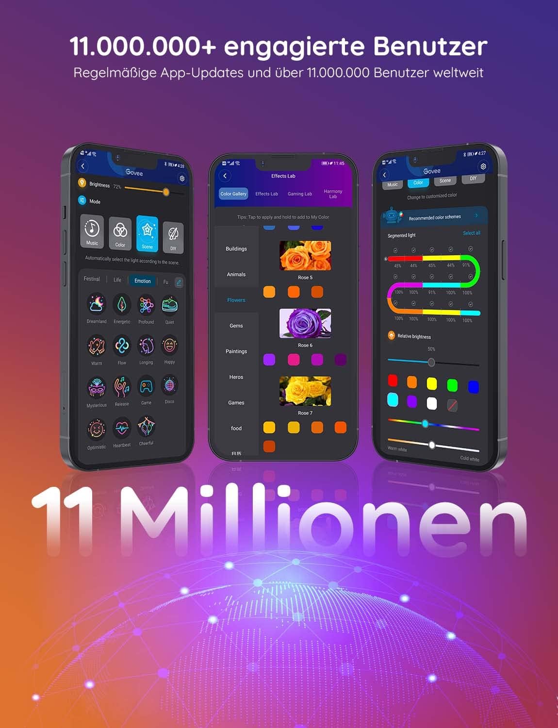 - Umfassende App-Funktionen: Die Govee Home App bietet Zugriff auf 16 Millionen Farben, DIY-Modi zur Erstellung eigener Effekte, Zeitpläne und die Möglichkeit, mehrere Geräte zu gruppieren.