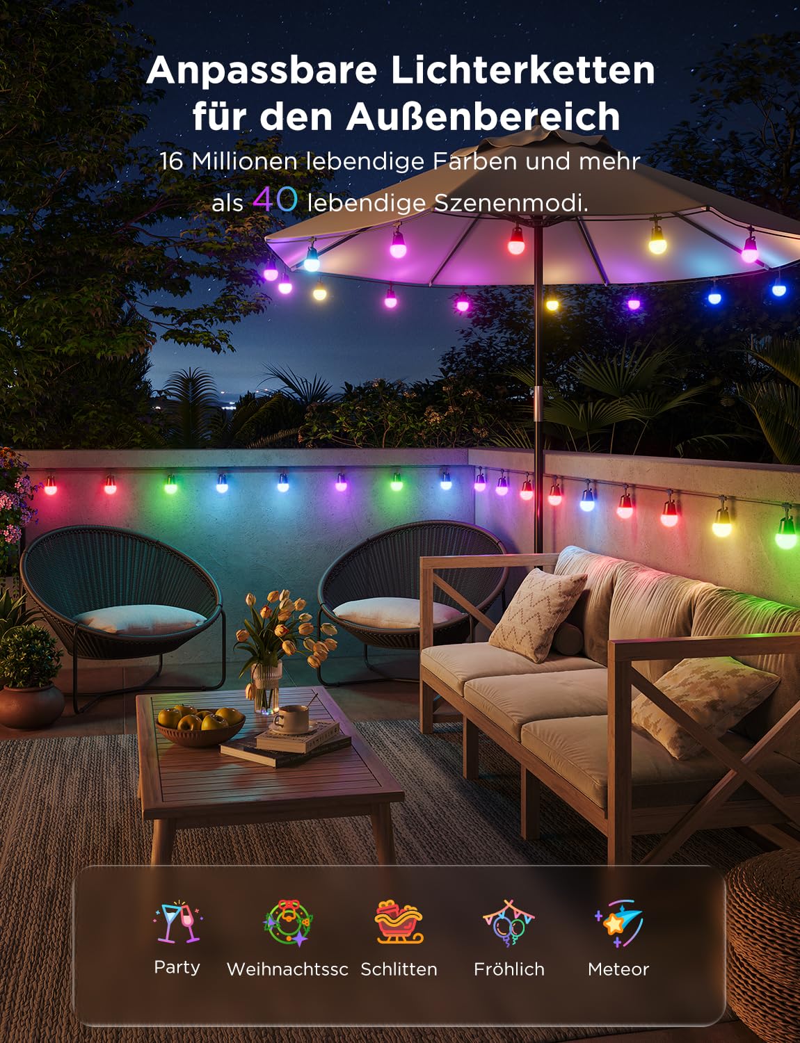 Verwandeln Sie Ihren Aussenbereich in eine Oase des Lichts. Diese 30 Meter lange LED-Lichterkette von Govee bietet unzählige Möglichkeiten, Ihren Garten, Balkon oder Ihre Terrasse für jeden Anlass stimmungsvoll in Szene zu setzen.