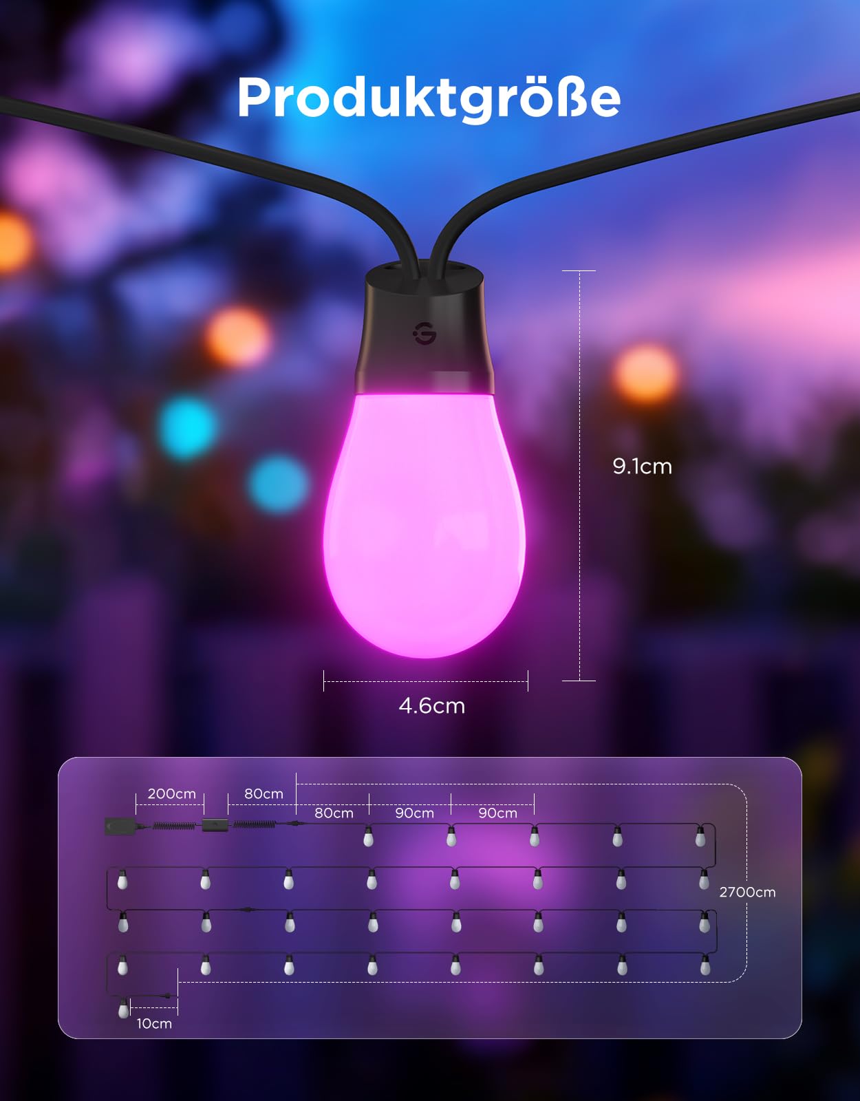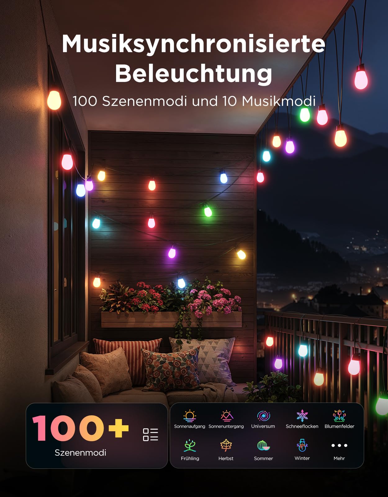 Verwandeln Sie Ihren Aussenbereich in ein stimmungsvolles Lichtermeer. Diese 30 Meter lange Lichterkette bietet unzählige Möglichkeiten, Ihren Garten, Balkon oder Ihre Terrasse individuell und intelligent zu beleuchten und für jede Gelegenheit die passende Atmosphäre zu schaffen.