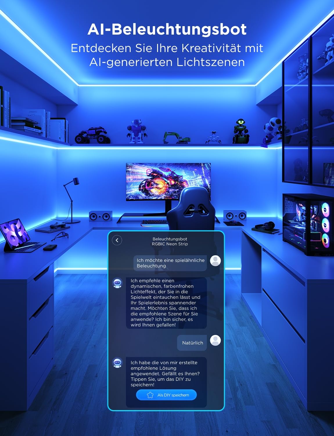 Ja, der Streifen ist dank Matter-Unterstützung vollständig mit Smart-Home-Systemen wie Alexa und Google Assistant kompatibel und lässt sich bequem per Sprachbefehl steuern. Zusätzlich bietet die Govee Home App über 99 Szenenmodi und einen KI-Bot zur Erstellung eigener Lichteffekte.