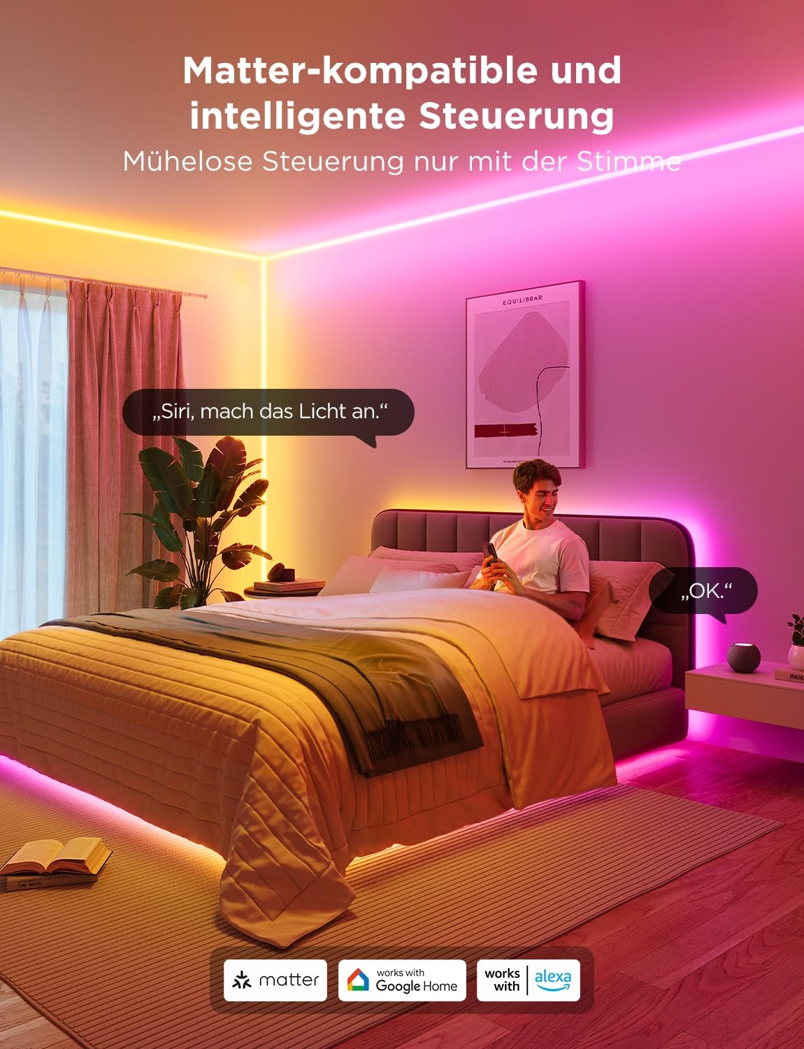 Dieser LED-Streifen integriert sich nicht nur optisch perfekt in Ihr Zuhause, sondern auch in Ihr Smart-Home-System. Dank der Matter-Kompatibilität steuern Sie die Beleuchtung mühelos per Sprachbefehl und synchronisieren sie mit anderen smarten Geräten. Gestalten Sie Lichtszenen, die sich Ihrer Stimmung oder Aktivität anpassen – von gemütlichen Abenden bis zu energiegeladenen Partys.