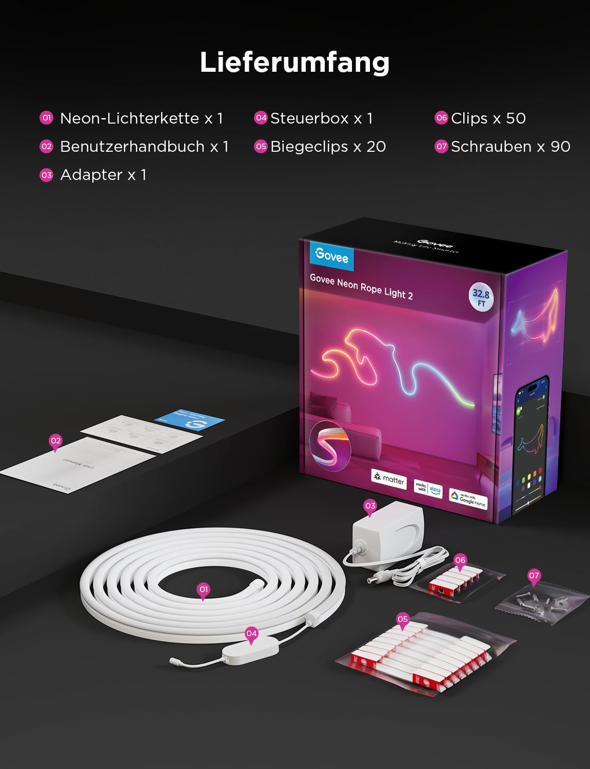 - Nahtlose Smart-Home-Integration: Dank Matter-Kompatibilität lässt sich der Lichtschlauch mühelos in Ihr bestehendes System integrieren und via Sprachbefehl über Alexa, Google Assistant oder Apple HomeKit steuern.