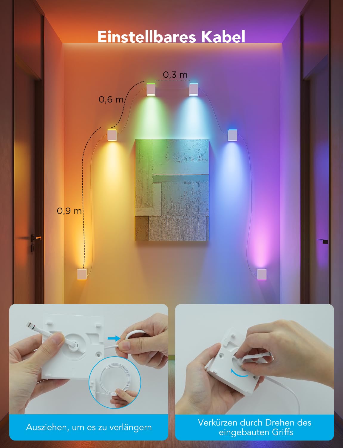 - Flexibler Abstand: Die Distanz zwischen den einzelnen Leuchtelementen lässt sich dank verstellbarer Kabel flexibel zwischen 27 cm und 90 cm anpassen.