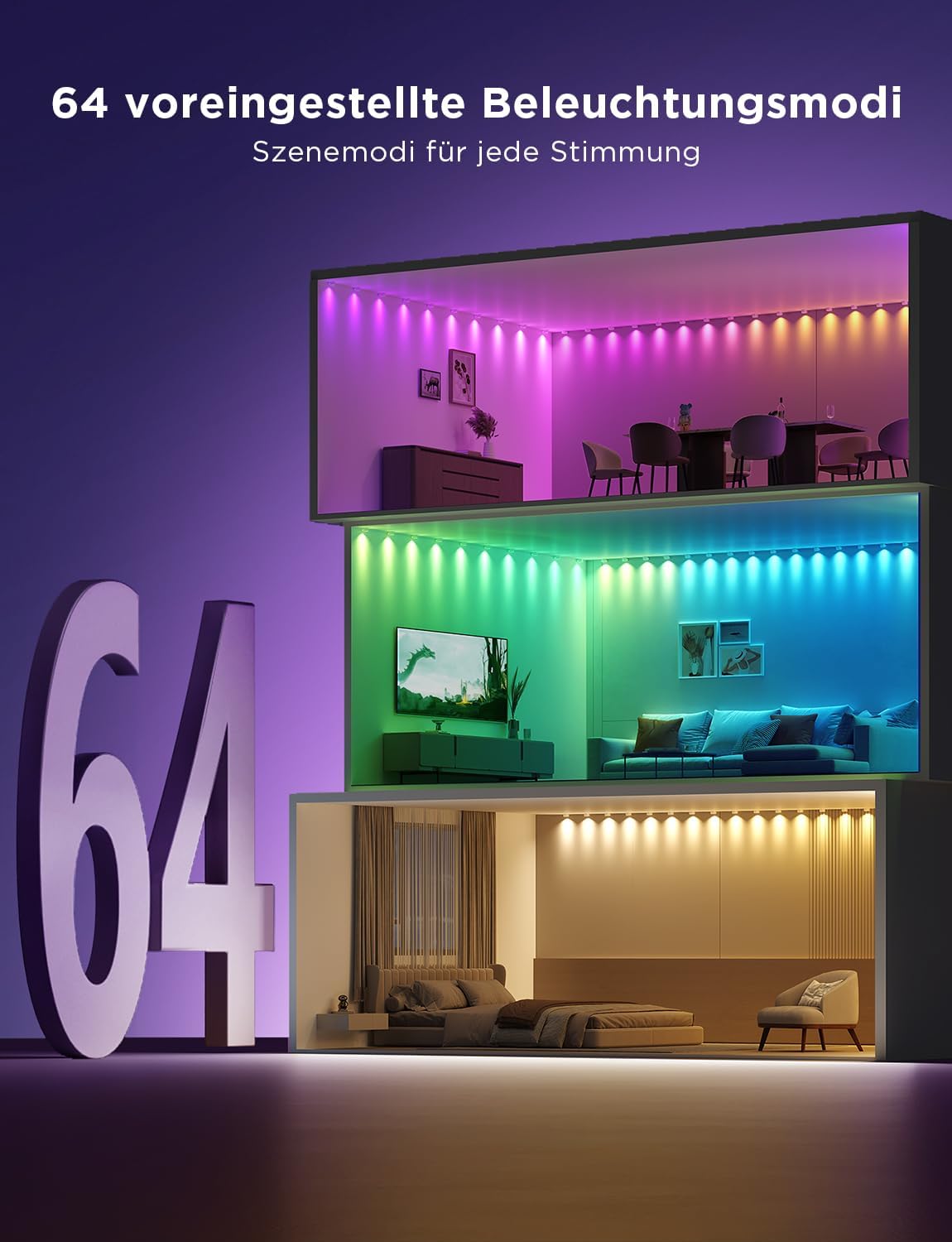 - Vielseitige Beleuchtungsmodi: Wechseln Sie bequem per Knopfdruck oder App zwischen verschiedenen voreingestellten Szenen, reaktiven Musik-Modi und eigenen Kreationen.
