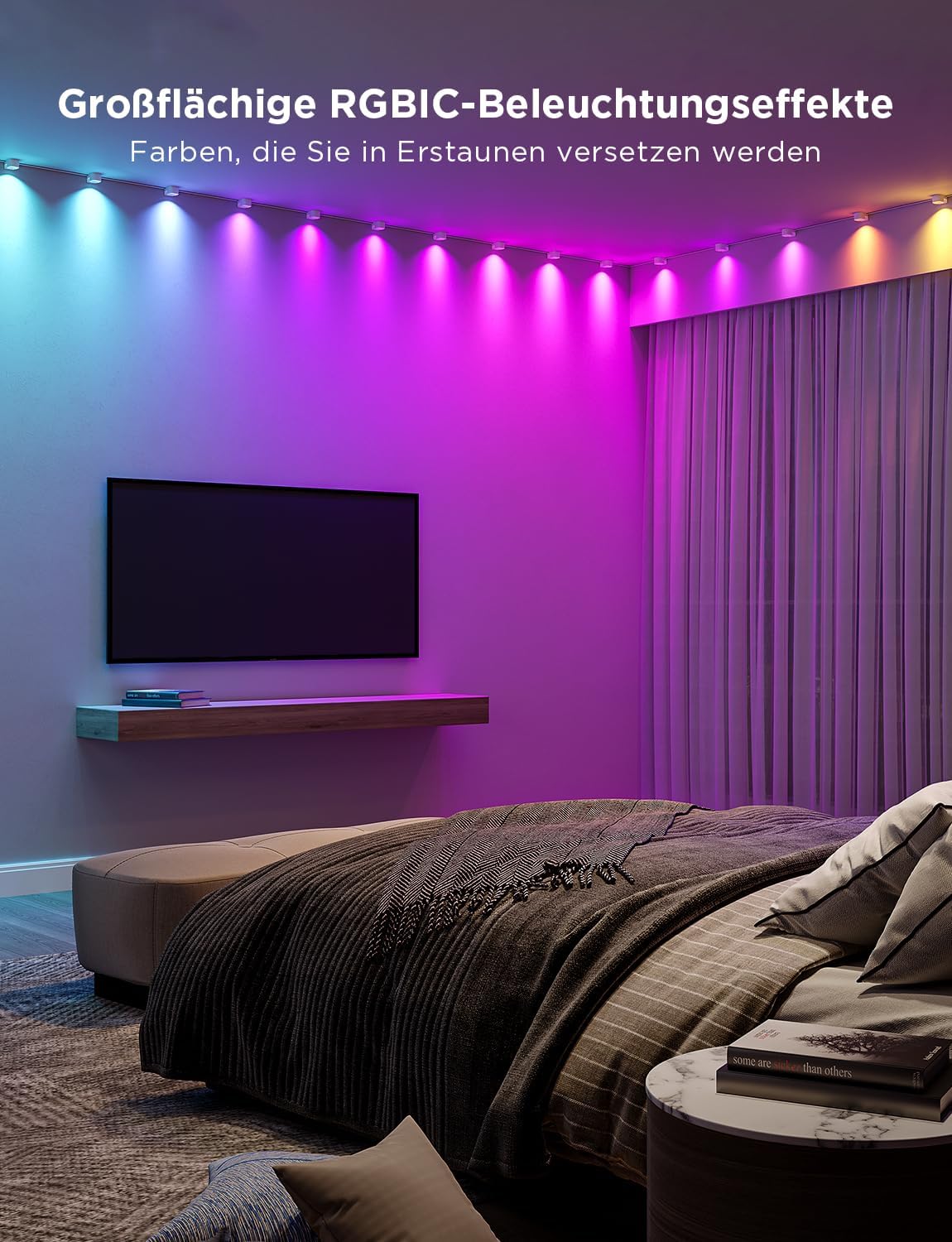 - Dynamische RGBIC-Farbtechnologie: Erleben Sie fliessende Farbübergänge und wählen Sie aus 16 Millionen Farben, um beeindruckende Lichteffekte mit einer Tiefe von bis zu 100 cm zu erzeugen.